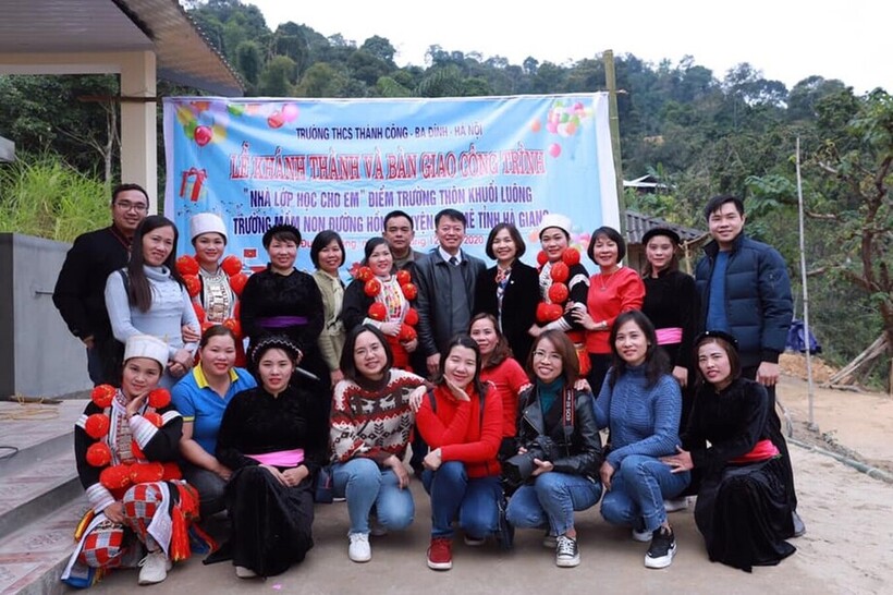Cô Tố Như (người ngồi thứ hai từ phải sang) cùng cán bộ giáo viên nhà trường trong lễ khánh thành và bàn giao công trình “Nhà lớp học cho em” tặng điểm trường thôn Khuổi Luông, trường mầm non Đường Hồng, huyện Bắc Mê, tỉnh Hà Giang.