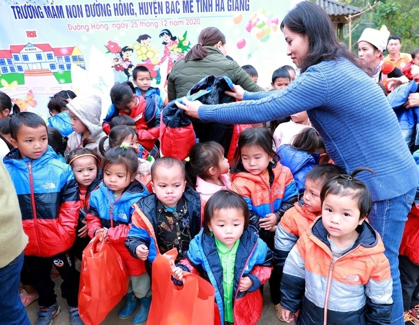 Cô Tố Như trao quà cho các em nhỏ trường mầm non Đường Hồng, huyện Bắc Mê, tỉnh Hà Giang