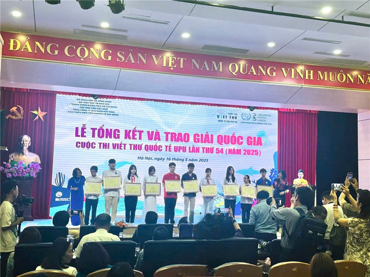 Học sinh Phạm Khánh Vy - trường THCS Thành Công - trong Lễ tổng kết và trao giải quốc gia Cuộc thi Viết thư Quốc tế UPU lần thứ 54
