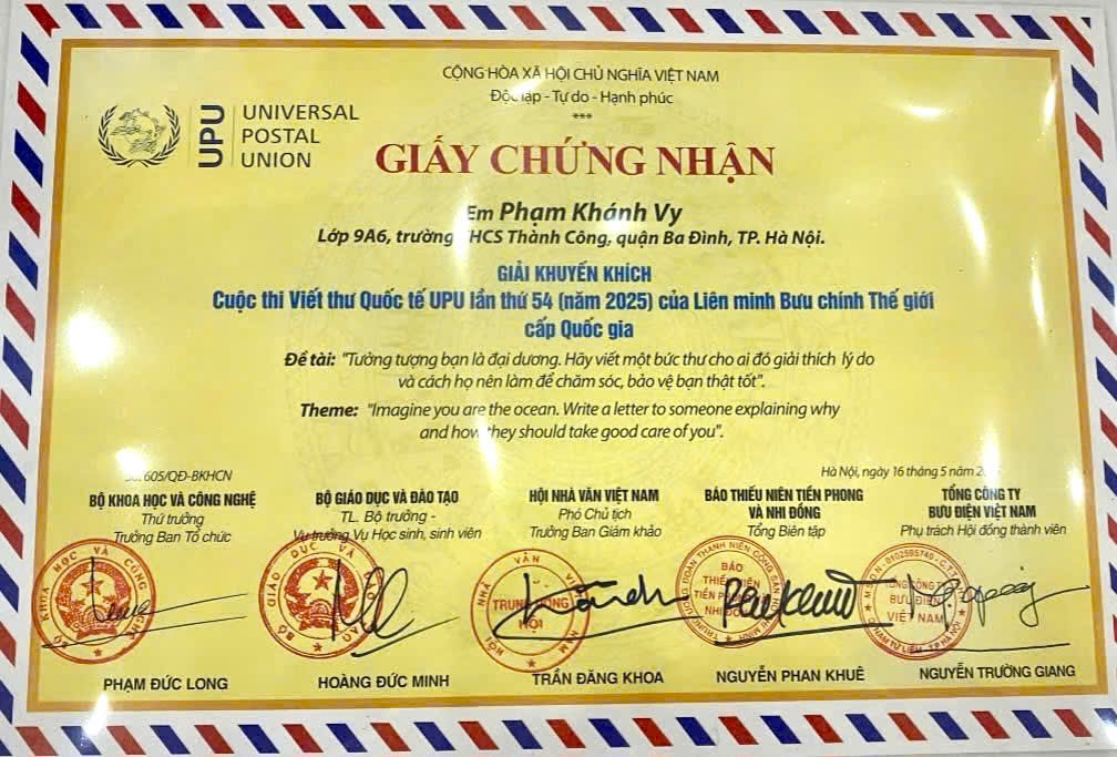 Cuộc thi Viết thư UPU hàng năm là một hoạt động giáo dục mang tính Quốc tế giúp học sinh rèn luyện khả năng viết văn, tư duy phản biện và cảm nhận xã hội. Việc học sinh Phạm Khánh Vy đạt giải quốc gia là niềm vinh dự lớn không chỉ đối với cá nhân em mà còn là niềm tự hào chung của nhà trường.