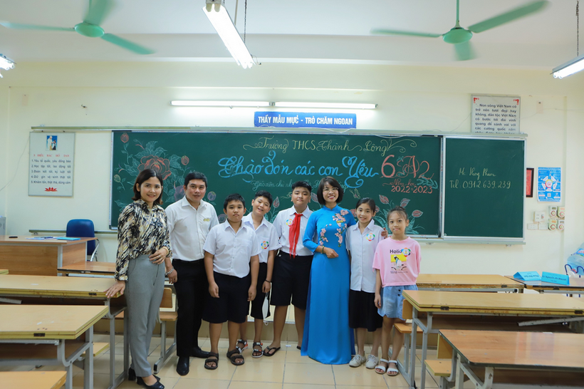 Học sinh Nguyễn Mai Hương và Trần Ngọc Linh (ngoài cùng bên phải) cùng GVCN, GV bộ môn lớp 6A2 và các bạn