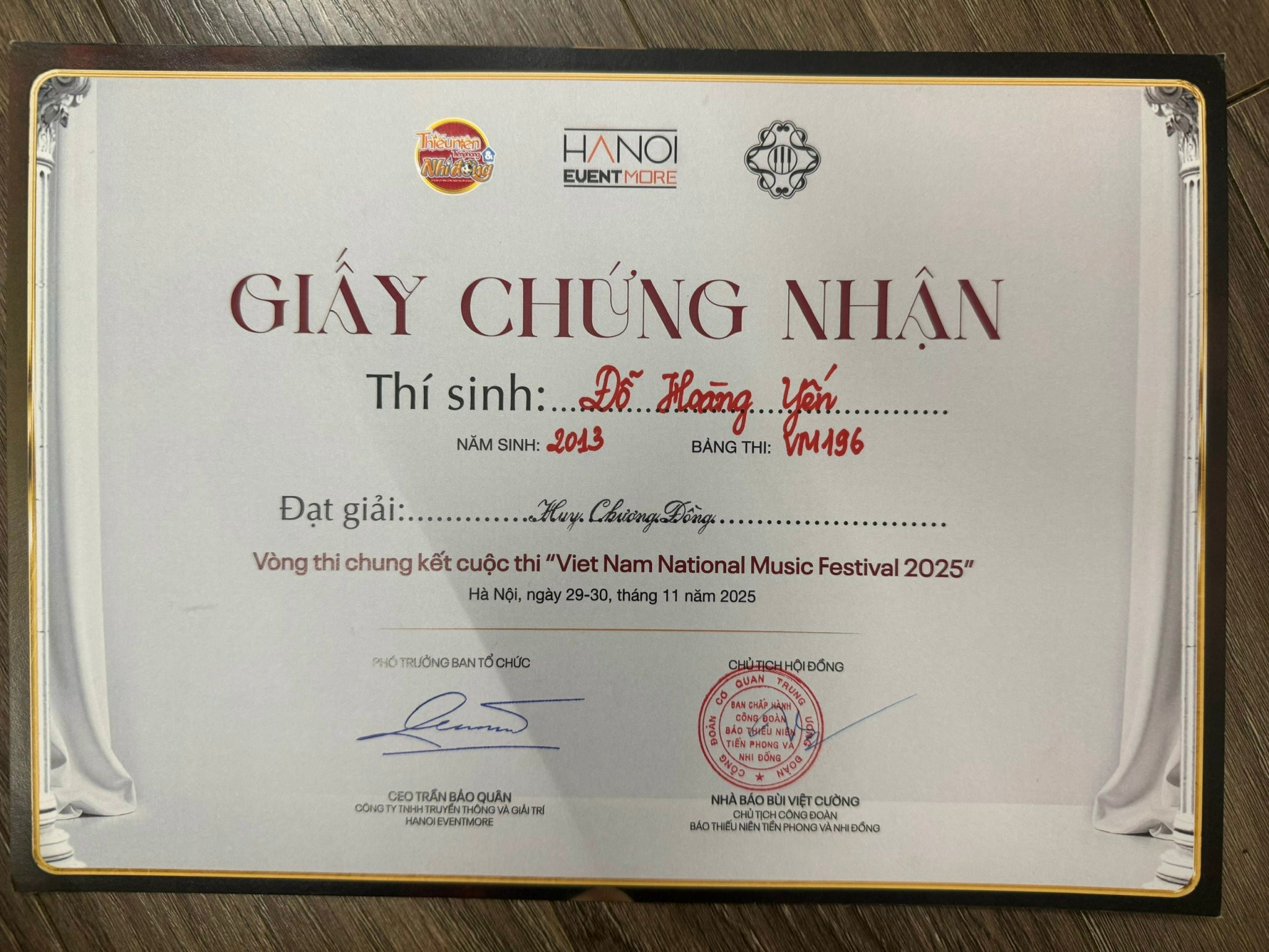 Niềm tự hào lớn nhất mà Hoàng Yến vừa mang về chính là Huy Chương Đồng trong hạng mục đấu giải Piano tại cuộc thi VietNam National Music Festival vừa qua. Đây là một sân chơi âm nhạc quy mô toàn quốc, quy tụ nhiều tài năng trẻ từ khắp mọi miền đất nước.