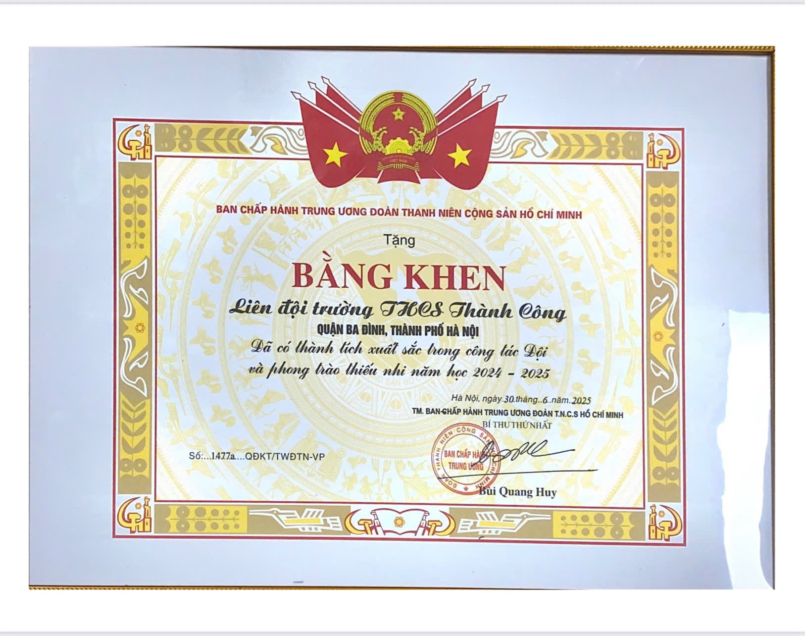 Tại Hội nghị, Liên đội trường THCS Thành Công vinh dự được Ban Chấp hành Trung ương Đoàn TNCS Hồ Chí Minh trao tặng Bằng khen vì có thành tích xuất sắc trong công tác Đội và phong trào thiếu nhi. Đây là phần thưởng xứng đáng cho tinh thần đoàn kết, sự sáng tạo và nhiệt huyết của thầy cô giáo cùng học sinh nhà trường trong năm học 2024-2025.