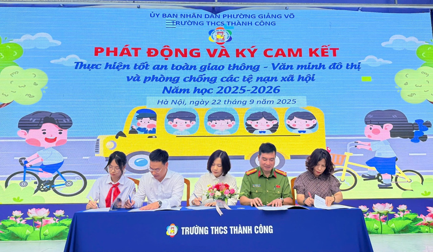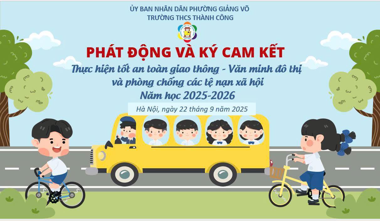 Sáng ngày 22/9/2025, trong không khí trang nghiêm của buổi chào cờ đầu tuần, trường THCS Thành Công đã tổ chức “Lễ ký cam kết thực hiện An toàn giao thông – Văn minh đô thị và phòng chống tệ nạn xã hội” năm học 2025 - 2026. Đây là một hoạt động thường niên nhằm nâng cao ý thức trách nhiệm, giảm thiểu tai nạn giao thông, lan tỏa văn hóa giao thông và phòng chống tệ nạn xã hội từ môi trường học đường.