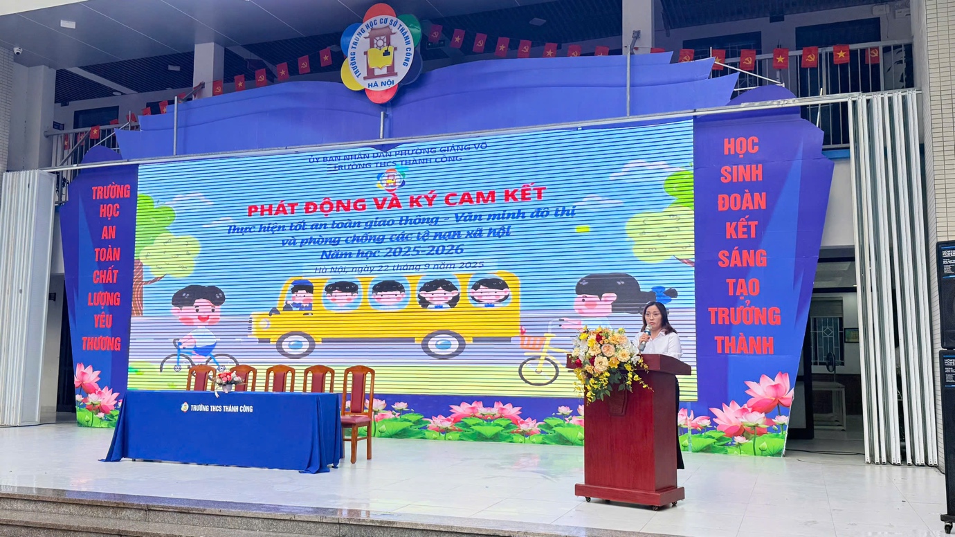 Tại buổi lễ, cô Nguyễn Ngọc Huyền – Phó Hiệu trưởng nhà trường đã có bài phát biểu nhấn mạnh tầm quan trọng của việc xây dựng văn hóa giao thông học đường, nâng cao ý thức phòng tránh tệ nạn xã hội và khẳng định quyết tâm của thầy trò trường THCS Thành Công trong việc thực hiện nghiêm túc các quy định. Ngay từ những buổi học đầu tiên, các thầy cô giáo chủ nhiệm và Ban phụ trách nhà trường đã hướng dẫn học sinh học tập và cam kết thực hiện tốt An toàn giao thông – Văn minh đô thị và phòng chống các tệ nạn xã hội.