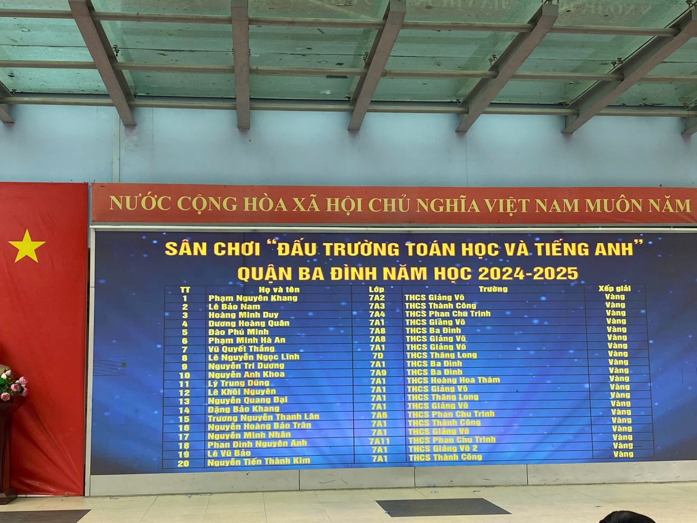 ​Ngày 23/4/2025, tại Trường Tiểu học Hoàng Hoa Thám, Phòng Giáo dục và Đào tạo quận Ba Đình đã tổ chức lễ trao giải cuộc thi “Tài năng Tin học trẻ quốc tế” và “Đấu trường Toán học và Tiếng Anh” năm học 2024–2025. Trong không khí trang trọng của buổi lễ, Trường THCS Thành Công đã được vinh danh với 53 giải thưởng với 5 Huy chương Vàng cùng giấy chứng nhận xếp loại “Tốt”, ghi dấu một năm học đầy nỗ lực và thành công.