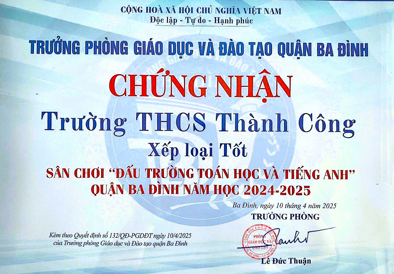 Đặc biệt, Trường THCS Thành Công cũng vinh dự nhận được giấy chứng nhận xếp loại "Tốt" từ Trưởng Phòng Giáo dục và Đào tạo quận Ba Đình, ghi nhận những thành tích nổi bật trong công tác giáo dục và sự cống hiến không ngừng của toàn thể giáo viên và học sinh. Đây là minh chứng cho sự lãnh đạo xuất sắc của Ban giám hiệu trong việc xây dựng và phát triển nhà trường trở thành một môi trường học tập chất lượng, nơi luôn khuyến khích sự sáng tạo và đổi mới.