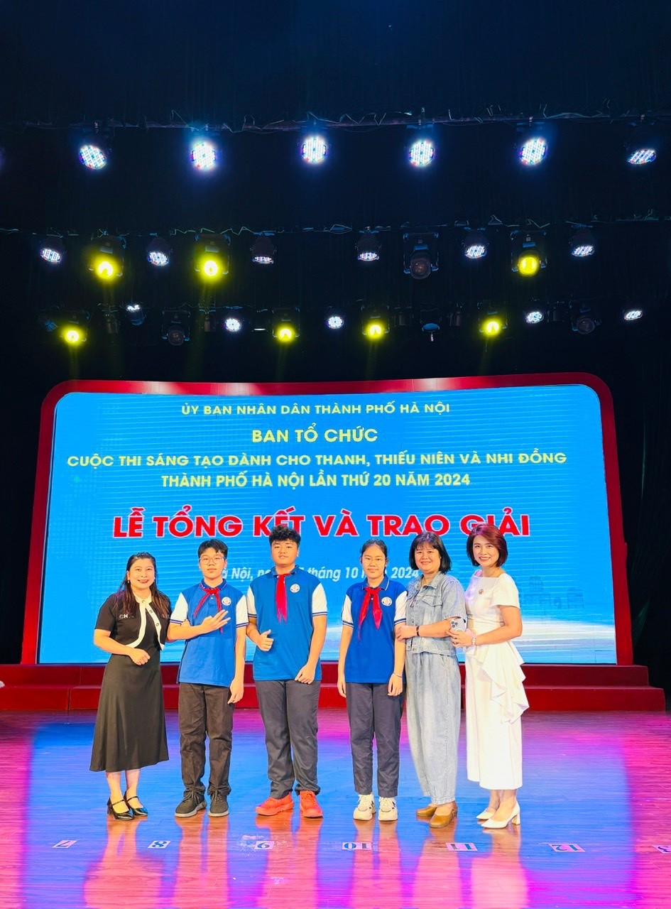 Cô giáo Trần Thị Quỳnh Hương (Phó hiệu trưởng nhà trường), cô giáo phụ trách Mai Thị Kim Tuyến cùng với học sinh của nhóm đề tài “Hệ mặt trời song ngữ Anh- Việt” tại buổi lễ trao giải