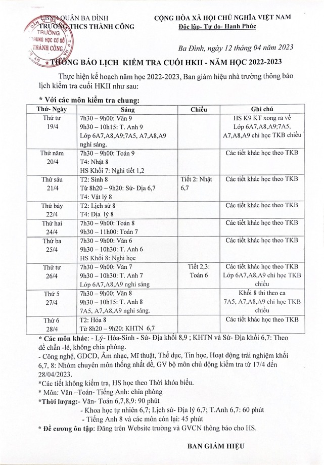 Dưới đây là đề cương ôn tập và lịch kiểm tra cuối năm học 2022-2023 của trường THCS Thành Công. Chúc các em học sinh ôn tập tốt và đạt kết quả cao trong kì thi!