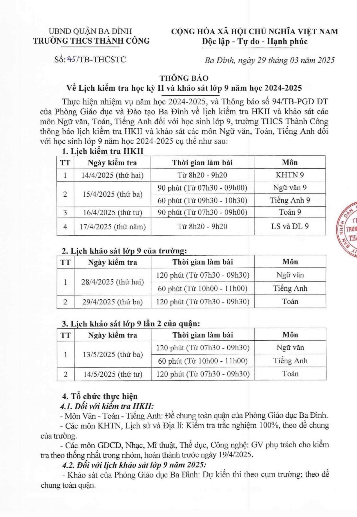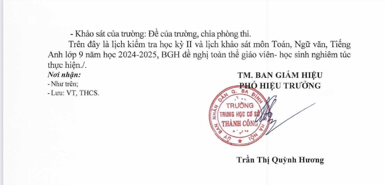 THÔNG BÁO: Hướng dẫn ôn tập và lịch kiểm tra cuối Học kì 2 và các lịch khảo sát của nhà trường và quận Ba Đình năm học 2024-2025 dành cho học sinh lớp 9 trong tháng 4 và tháng 5/2025. Chúc các con học sinh ôn tập tốt và đạt kết quả cao trong các cuộc thi và kỳ khảo sát. Chúc các con học tập hiệu quả và đạt thành tích như ý trong kì thi vào lớp 10 THPT sắp tới!