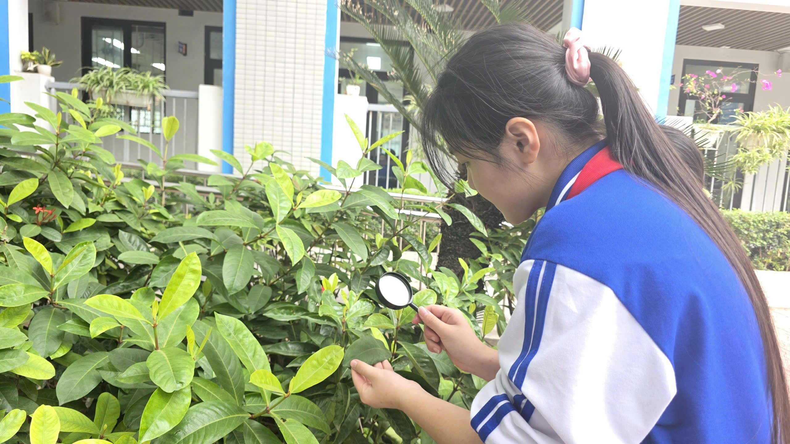 Bạn Thảo Chi đang ngắm những chiếc lá cây qua kính lúp