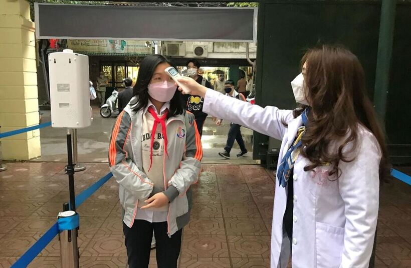 Cô Ngân đo thân nhiệt hàng ngày cho học sinh khi các con đến trường