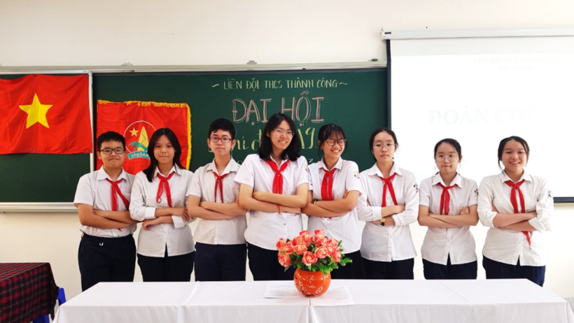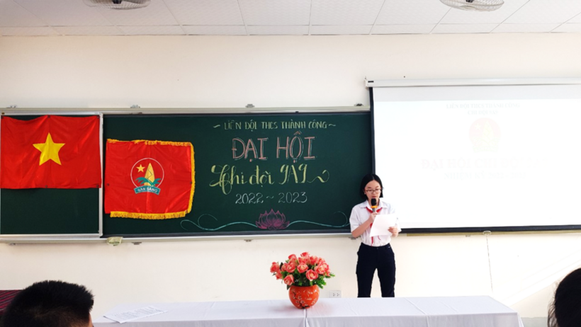 Đoàn Chủ tịch làm việc rất nghiêm túc. Bạn Chi đội trưởng Ngô Quang Vũ báo cáo tổng kết công tác Đội năm học 2021-2022 và nêu phương hướng nhiệm vụ năm học 2022-2023. Chi đội phấn đấu 100% đội viên tốt nghiệp THCS đạt loại khá và giỏi; 100% đội viên đỗ vào lớp 10 THPT trong đó 90% đỗ nguyện vọng 1, 10% đỗ nguyện vọng 2. Riêng các trường Chuyên hoặc khối chuyên các trường, 30% đội viên đăng kí và phấn đấu đỗ nguyện vọng chuyên.