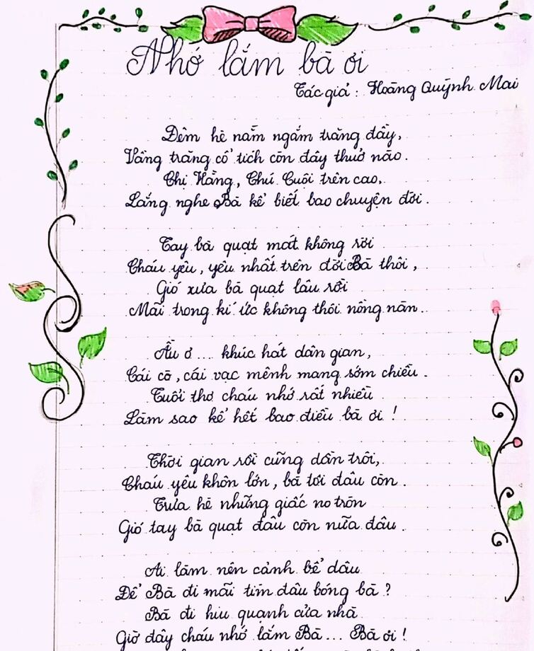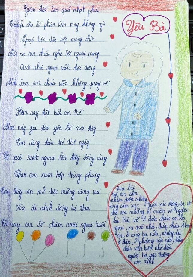 “Qua bài thơ, em cảm nhận được những dòng cảm xúc thật xúc động, ùa về trong em những kỉ niệm về bà. Bài thơ nói về một đứa cháu xa bà ngoại, xa quê nhà. Đứa cháu không còn ở cùng bà nữa, nhưng dù ở nơi đâu, ở phương trời nào, cháu vẫn luôn nhớ đến người bà yêu thương của mình.” (Cảm nhận của Nguyễn Như Bảo Vy, 6A1)