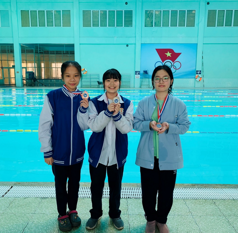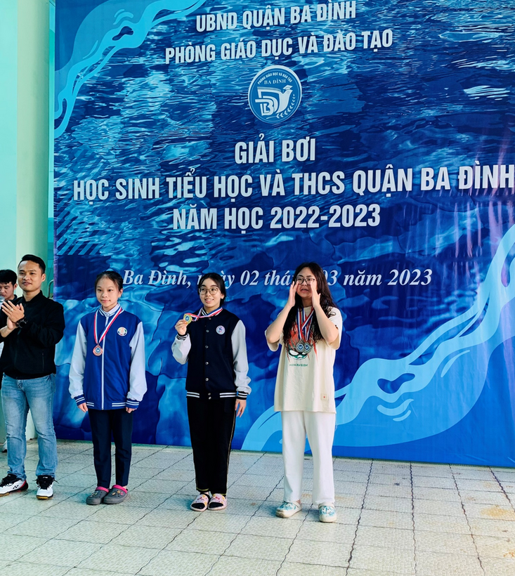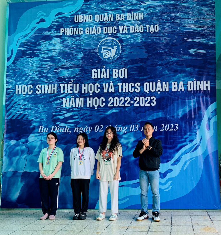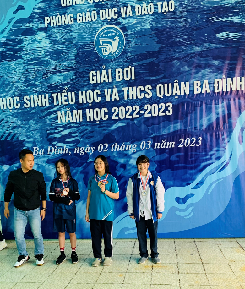 Dù không có điều kiện rèn luyện ngay tại trường, thầy huấn luyện Nguyễn Đức Mạnh và các vận động nhí vẫn miệt mài có mặt ở các bể bơi trong quận, tranh thủ từng giờ từng phút tập luyện. Những giọt mồ hôi hòa lẫn làn nước xanh biếc chỉ làm tăng thêm ý chí chiến thắng, khát vọng chạm tay vào chiếc huy chương của các “kình ngư” nhỏ. Sự động viên của thầy và nỗ lực của bản thân các con đã đem lại trái ngọt đáng tự hào: 1 huy chương Bạc của Trịnh Phương Mai lớp 6A5, 2 huy chương Đồng của Nguyễn Linh Nhi lớp 8A6 và Phạm Khánh Linh lớp 9A6.