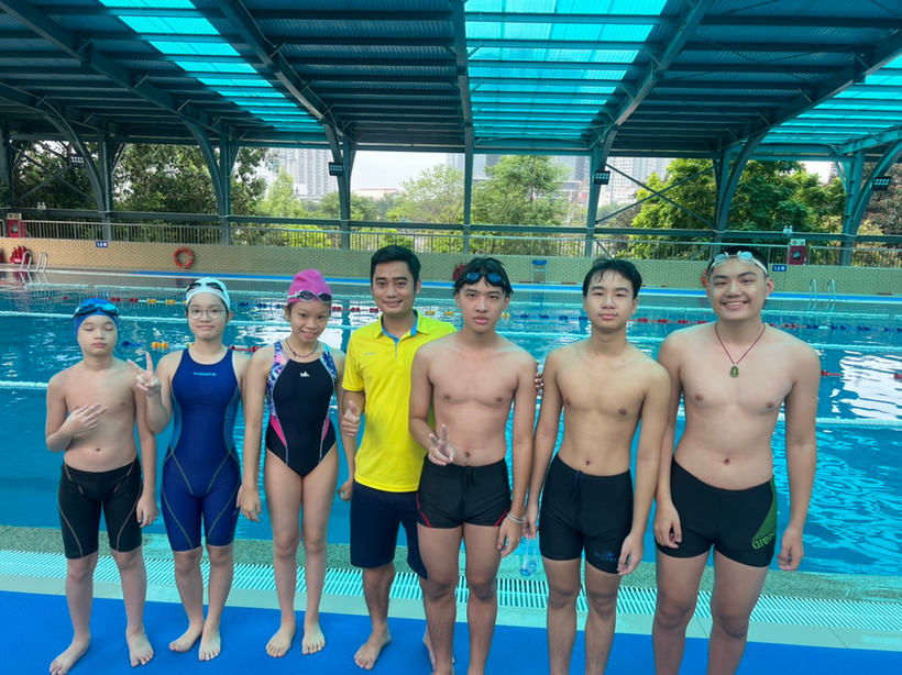 Thầy giáo Nguyễn Đức Mạnh cùng các học sinh của đội Bơi nhà trường