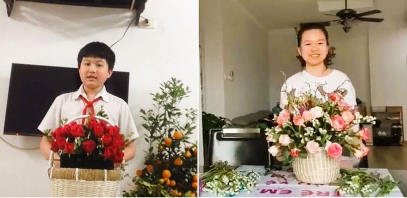 Các con học sinh chuẩn bị những bó hoa đầy màu sắc cho hội thi.