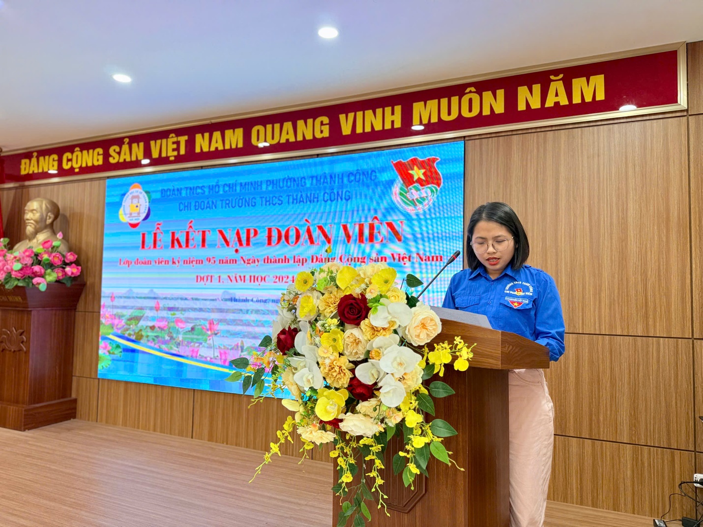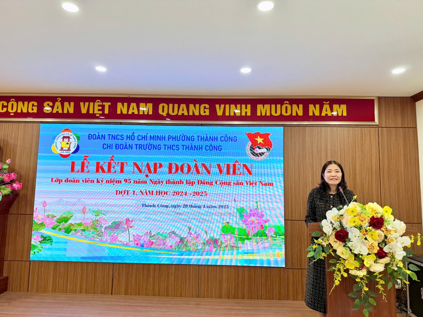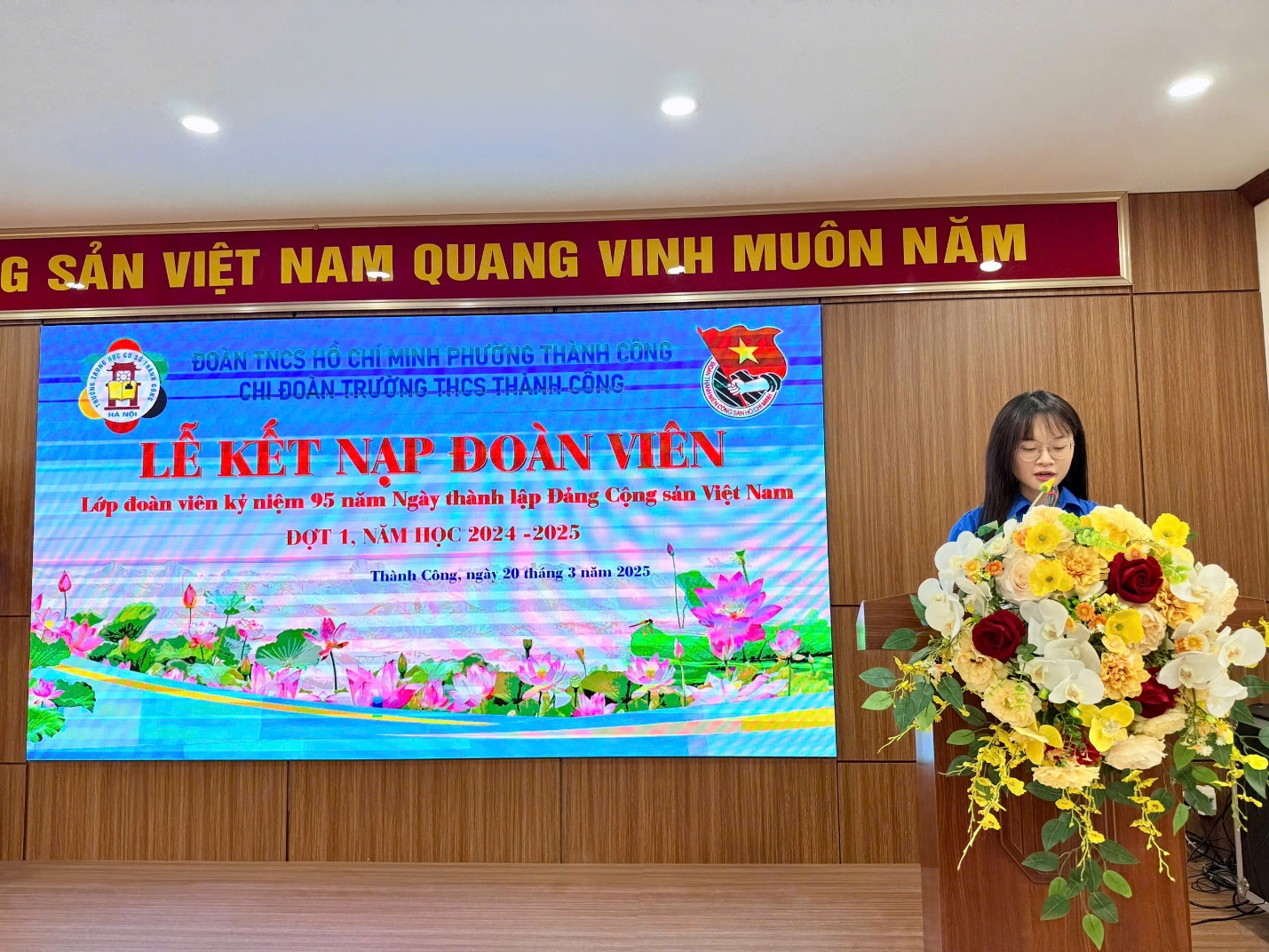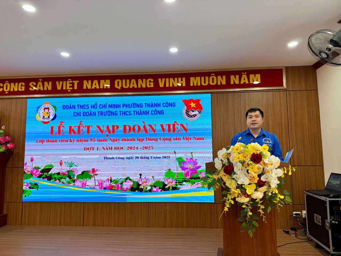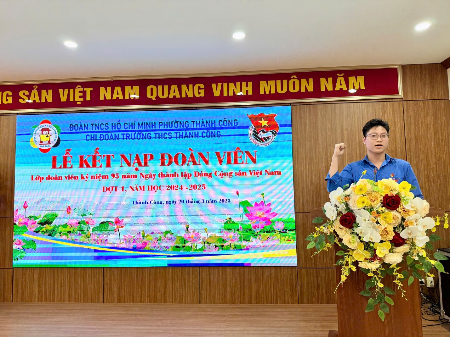 Thực hiện Chương trình công tác đoàn và phong trào thanh thiếu nhi năm 2025; kỉ niệm 111 năm ngày sinh đồng chí Lý Tự Trọng – người đoàn viên thanh niên cộng sản đầu tiên (20/10/1914 - 20/10/2025), 135 năm ngày sinh Chủ tịch Hồ Chí Minh (19/5/1890 - 19/5/2025); Chi đoàn TNCS Hồ Chí Minh trường THCS Thành Công tổ chức Lễ kết nạp Đoàn cho 44 Đội viên ưu tú nhằm tạo khí thế thi đua sôi nổi lập thành tích chào mừng 95 năm ngày thành lập Đoàn TNCS Hồ Chí Minh (26/3/1931-26/3/2025).