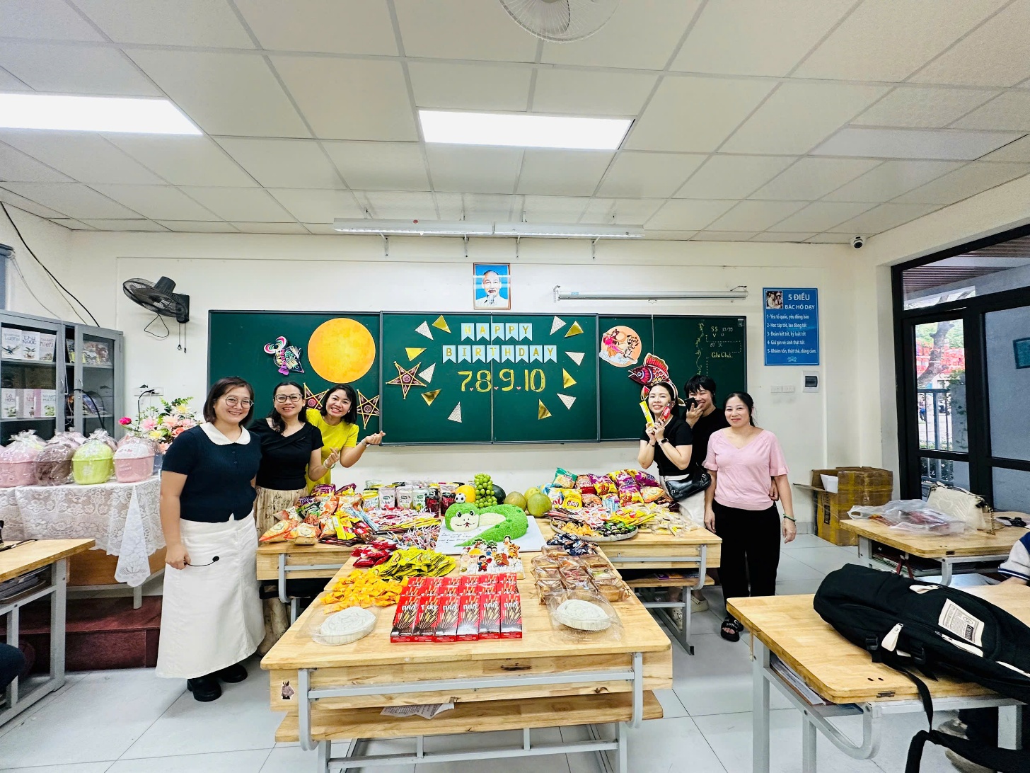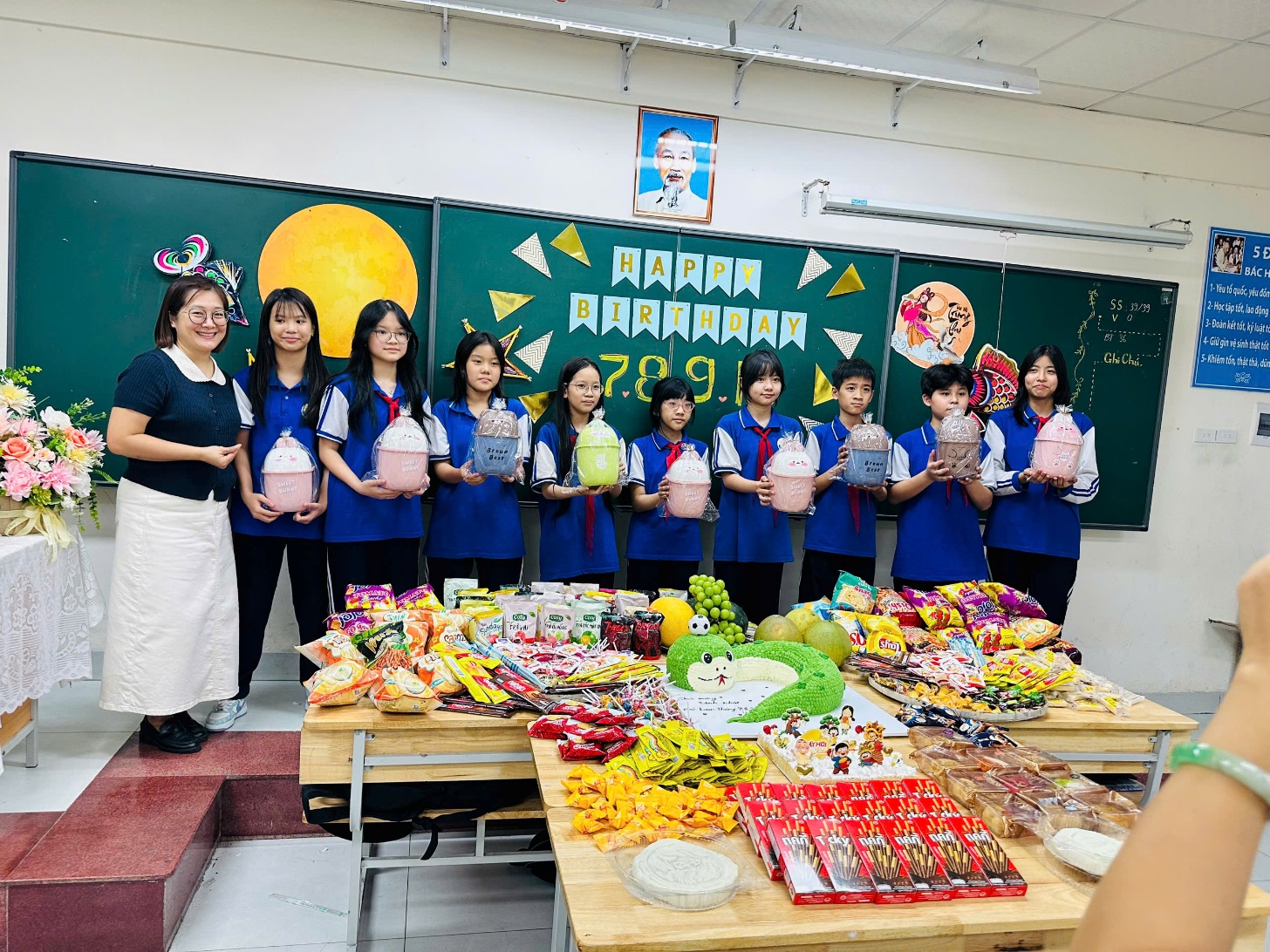 Bên cạnh niềm vui phá cỗ, lớp còn tổ chức sinh nhật cho các bạn có ngày sinh trong các tháng 7, 8, 9, 10. Những lời chúc tốt đẹp, những tràng pháo tay nồng nhiệt cùng chiếc bánh sinh nhật đầy sắc màu đã tạo nên khoảnh khắc thật đáng nhớ. Đây cũng là món quà tinh thần giúp các bạn cảm nhận được sự quan tâm, yêu thương từ thầy cô, bạn bè.