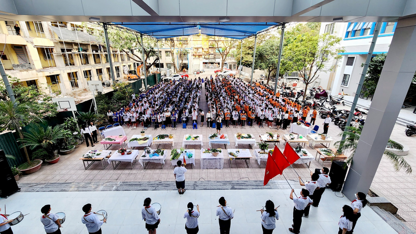 Đội nghi thức và học sinh toàn trường chỉnh tề trong giờ phút trang nghiêm