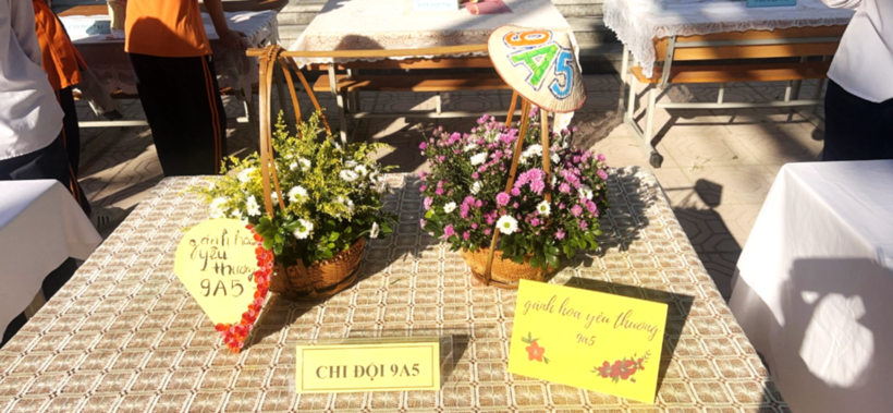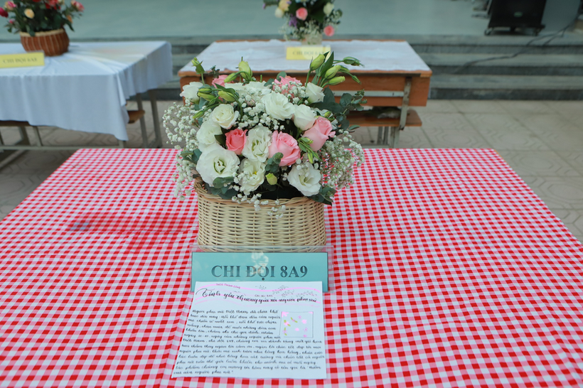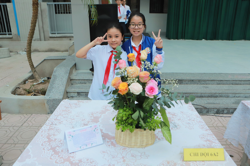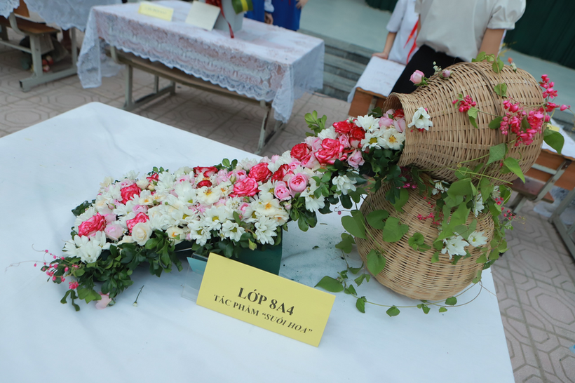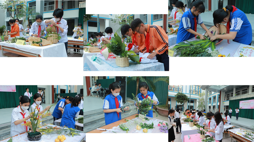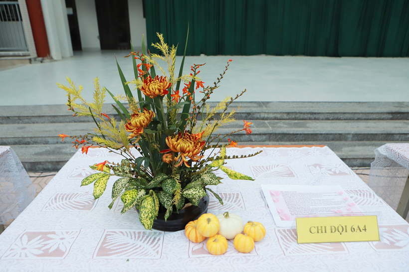 Và phần chúng tớ mong chờ nhất đã đến: Hội thi Cắm hoa đã bắt đầu. Mỗi chi đội có 20 phút để thể hiện tác phẩm của mình. Những đoá hoa tươi được các bạn lựa chọn từ sáng sớm, những phụ kiện đi kèm cũng rất phong phú và đa dạng. Chúng tớ cứ nghĩ, cắm hoa là ưu thế của phái đẹp. Nhưng thật bất ngờ là trong hội thi này, có rất nhiều bạn nam tham gia.
