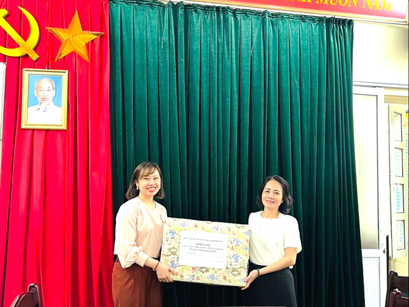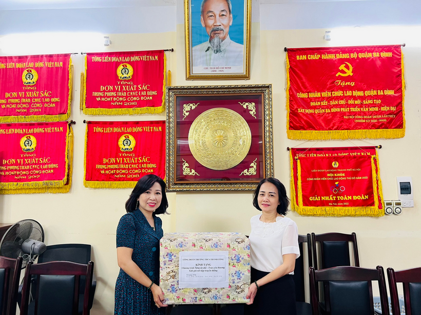 Đồng chí Lã Minh Phương – Chủ tịch Công đoàn trường THCS Thành Công trao tặng áo dài lên Liên đoàn Lao động Quận Ba Đình và đồng chí Nguyễn Thanh Minh - Ủy viên Ban thường vụ Liên đoàn Lao động quận nhận.
