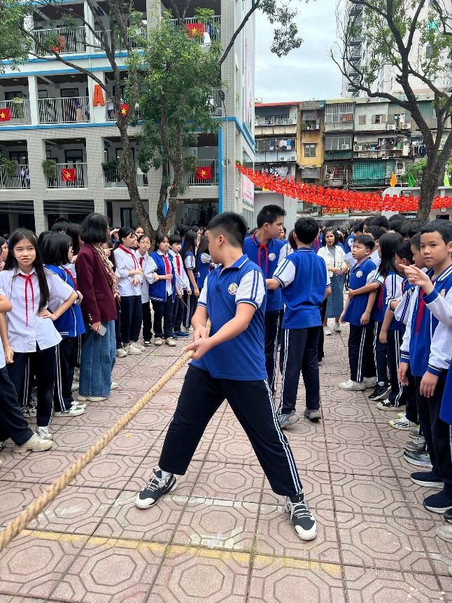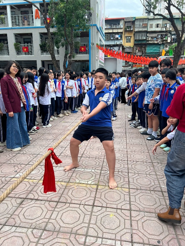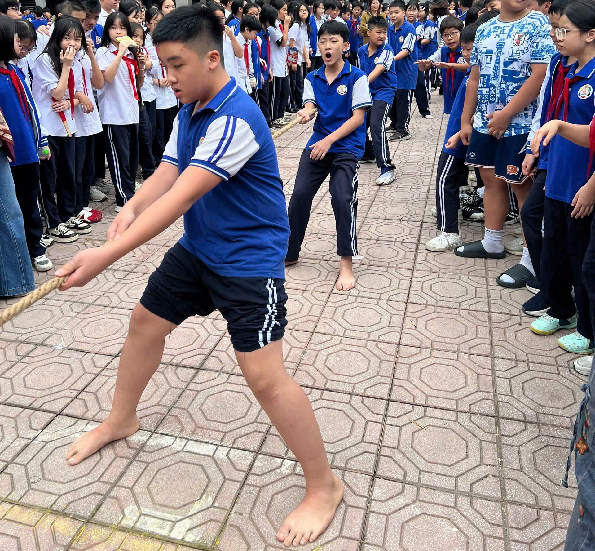 Trận thi đấu giữa 7A2 và 7A1 là một trong những màn đối đầu gay cấn nhất của hội thi năm nay. Ngay khi tiếng còi vang lên, cả hai đội lập tức vào thế, tay nắm chặt sợi dây thừng, chân trụ vững xuống sân trong tiếng reo hò cổ vũ vang dội khắp sân trường. 7A1 khởi đầu mạnh mẽ với những cú giật dây liên tiếp khiến đội bạn phải lùi lại đôi chút, nhưng 7A2 hoàn toàn không nao núng. Các bạn nhanh chóng ổn định đội hình, giữ nhịp đều, phối hợp ăn ý và bắt đầu phản công bằng những cú kéo chắc nịch. Tiếng hô “1, 2… kéo!” vang lên nhịp nhàng, từng bước lùi mạnh mẽ đã khiến sợi dây thừng dần nghiêng về phía 7A2. Không khí trở nên căng thẳng hơn bao giờ hết khi cả hai đội đều dồn toàn bộ sức lực cho những giây cuối cùng, gương mặt đỏ bừng, mồ hôi ướt trán nhưng ánh mắt vẫn đầy quyết tâm. Và rồi, trong khoảnh khắc bùng nổ nhất, lá cờ đỏ nhỏ ở giữa dây thừng nghiêng hẳn về phía 7A2, đánh dấu chiến thắng đầy thuyết phục của lớp. Trận đấu với 7A1 đã để lại kỷ niệm khó quên, không chỉ vì kết quả, mà vì tinh thần đồng đội mạnh mẽ, sự nỗ lực hết mình và khí thế thể thao rực cháy mà cả hai lớp đã mang đến. Đó cũng chính là món quà tinh thần mà chúng em muốn gửi tới thầy cô – những người đã luôn đồng hành, động viên và tiếp thêm sức mạnh cho chúng em trên hành trình học tập và trưởng thành.