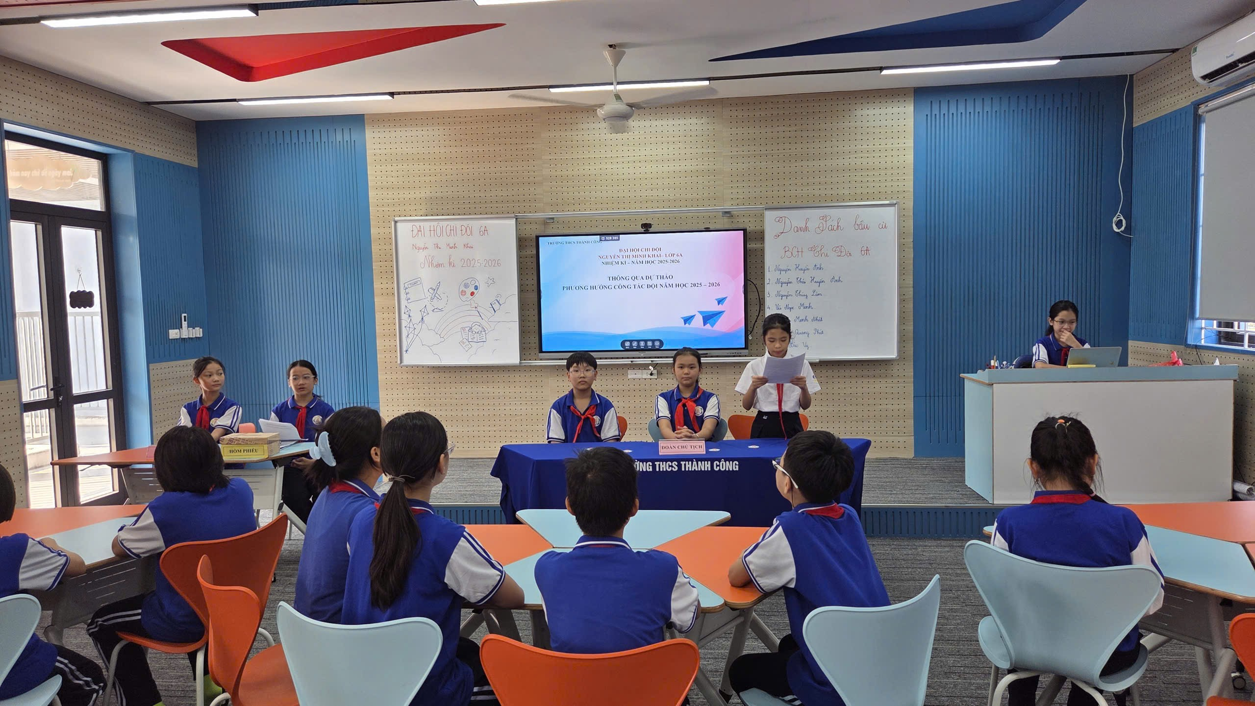 Trước khi tổ chức Đại hội chi đội, cả lớp đều chuẩn bị rất kỹ càng. Có bạn lo sắp xếp bàn ghế, có bạn chuẩn bị slide trình chiếu, có bạn viết giấy tờ báo cáo. Mọi người đều nghiêm túc nhưng cũng rất háo hức.