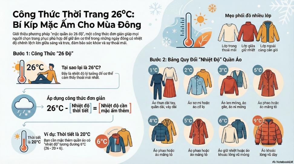 Ví dụ nè: Nếu hôm nay dự báo thời tiết là 20°C, bạn chỉ cần lấy 26 - 20 = 6. Vậy là bạn cần chọn đồ sao cho cộng lại đúng bằng 6°C là chuẩn nhất!