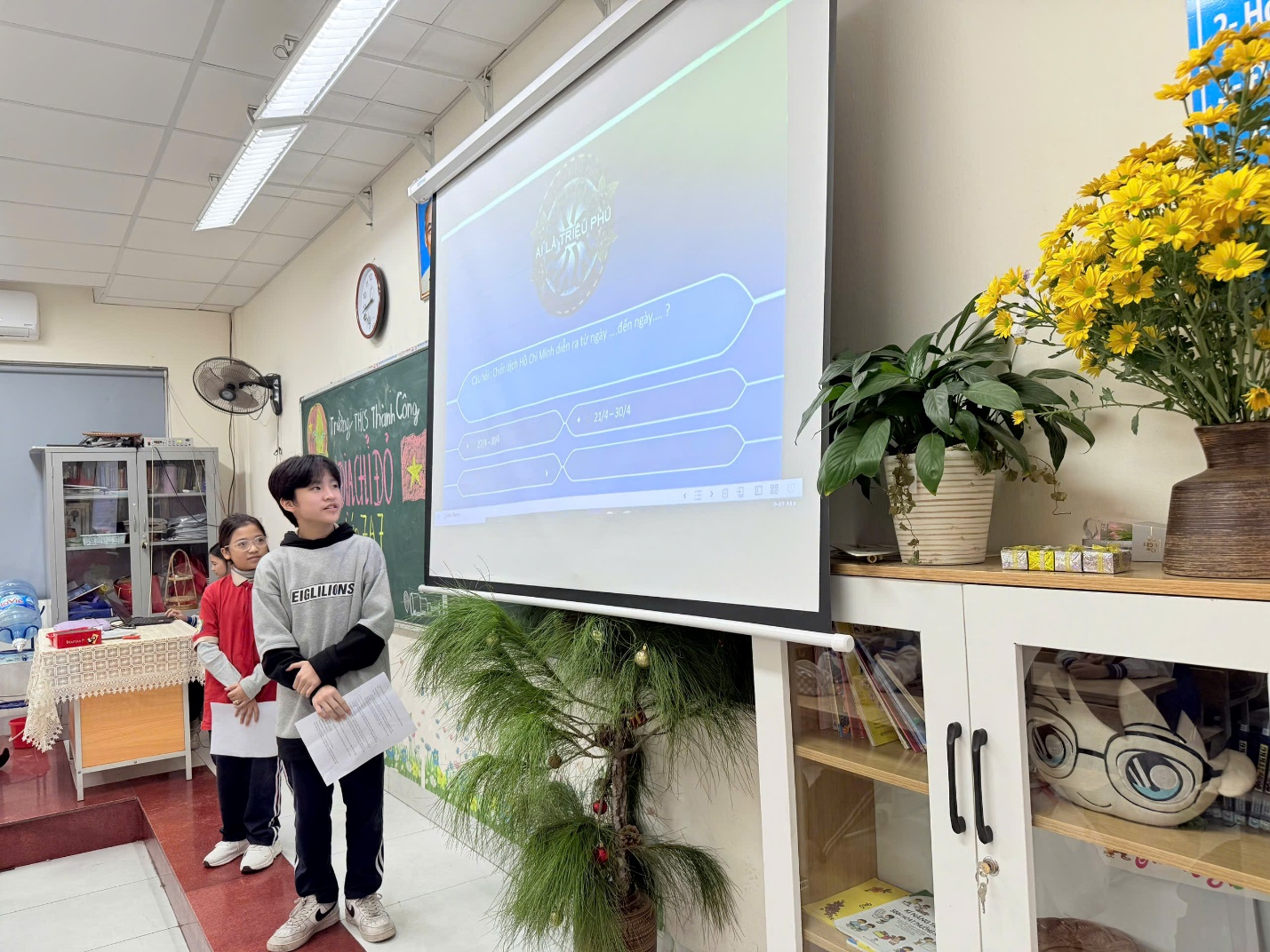 Nhóm bạn đã trình bày rõ ràng và cuốn hút, kèm theo những hình vẽ minh họa sinh động trên bảng về cấu trúc địa đạo, các phòng chức năng như bếp Hoàng Cầm, bệnh xá, kho lương thực… Những câu chuyện về sự sáng tạo và kiên cường của quân dân ta ở Củ Chi đã khiến cả lớp cảm thấy vô cùng tự hào. Ngoài ra, các nhóm khác cũng không kém phần ấn tượng khi giới thiệu về thành cổ Quảng Trị, nơi diễn ra trận đánh 81 ngày đêm khốc liệt; nhà tù Côn Đảo, nơi từng giam giữ nhiều chiến sĩ cách mạng kiên trung, biểu tượng của tinh thần “uống nước nhớ nguồn.” Mỗi phần thuyết trình đều được đầu tư kỹ lưỡng, giúp cả lớp có cái nhìn toàn diện hơn về những trang sử vẻ vang của dân tộc. Sau phần thuyết trình, lớp còn tổ chức trò chơi đố vui về các địa danh lịch sử để kiểm tra và củng cố kiến thức.