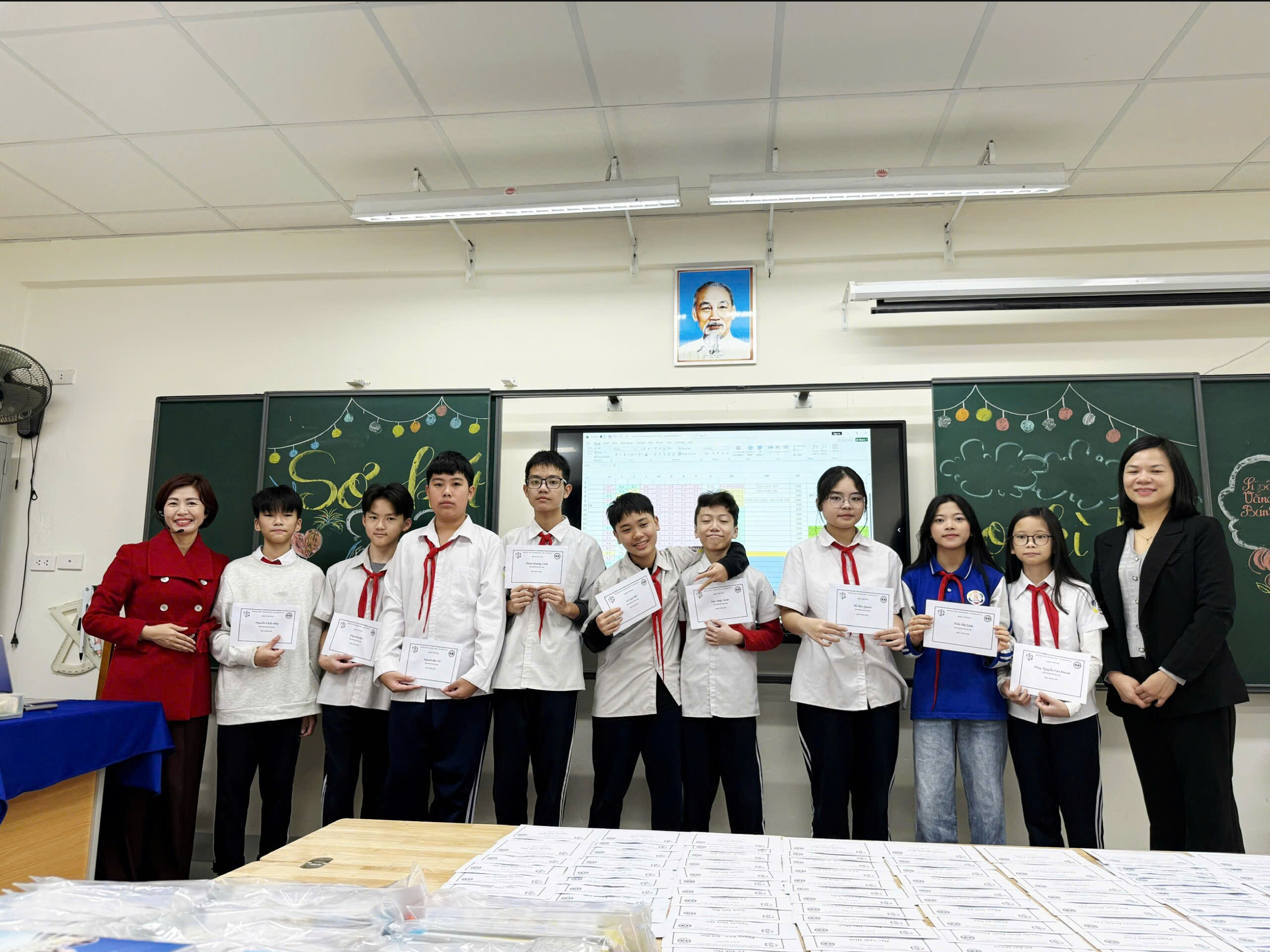 Cô Hồng và Ban phụ huynh lớp 7A1 trao thưởng cho các bạn học sinh