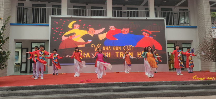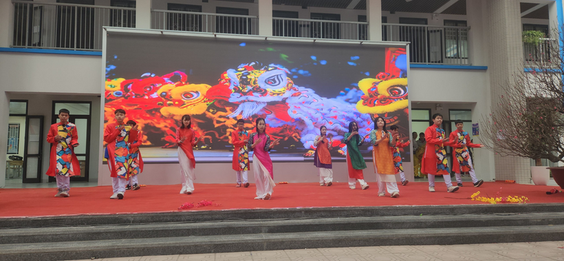 Các thành viên lớp 8A5 trình diễn tiết mục “Liên khúc chào xuân”