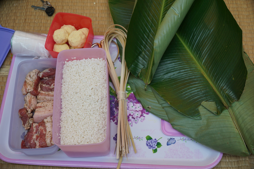 Thế rồi, các bạn nhanh tay thao tác trải lá ra mâm, đong một bát gạo đổ vào, dàn đều rồi đổ nửa bát đỗ, xếp hai miếng thịt, lại thêm nửa bát đỗ, một bát gạo nữa. Khéo léo đãi gạo che kín đỗ và thịt rồi nhẹ nhàng bẻ bốn góc lá cho vuông vức, sau đó siết chặt từng chiếc lạt. Với sự giúp đỡ của các bác phụ huynh và cô giáo chủ nhiệm chẳng mấy chốc, chiếc bánh chưng xanh đã được gói xong.