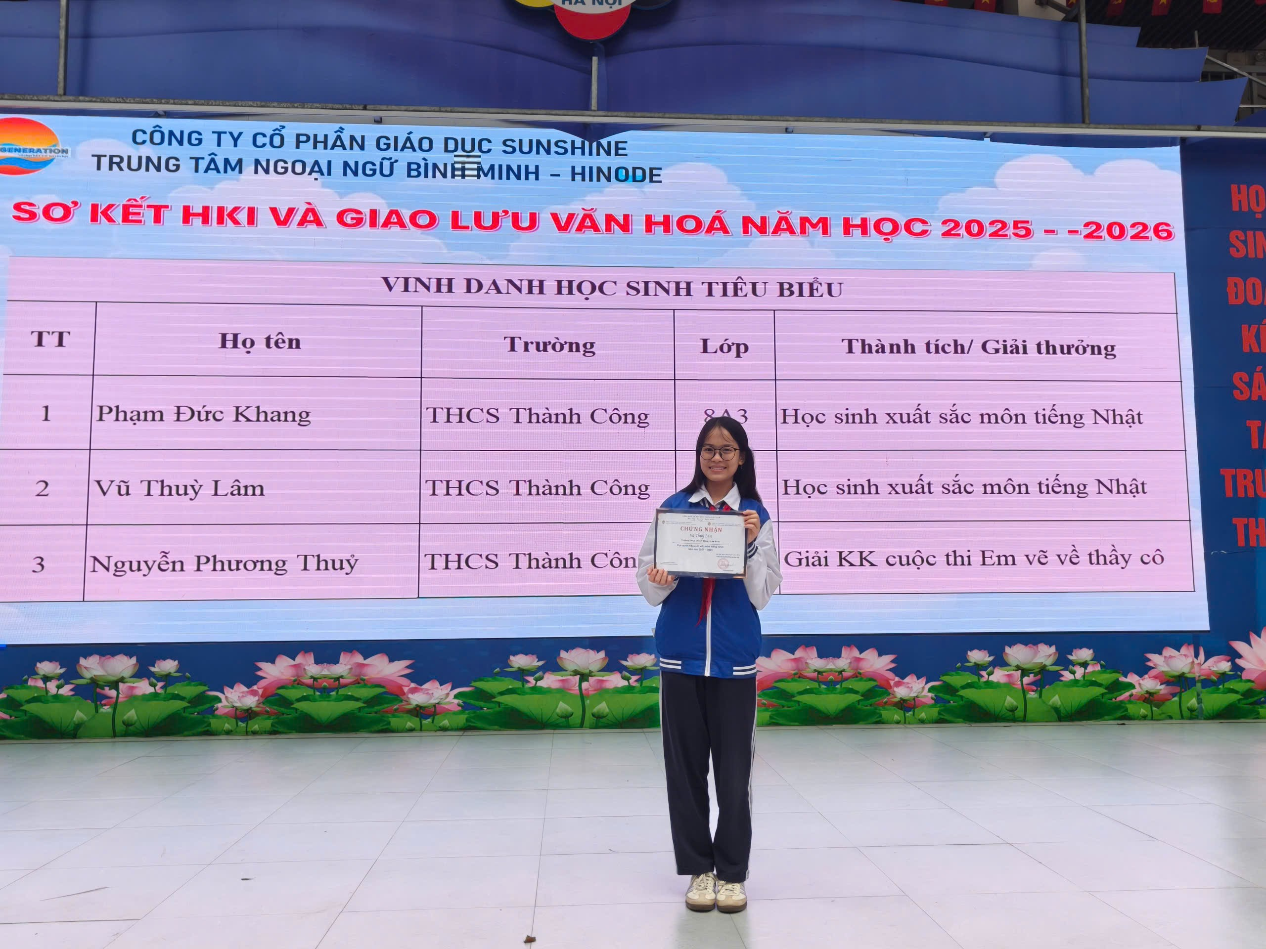 Trong không khí rộn ràng của Buổi sơ kết học kì I và Ngày hội giao lưu văn hóa – hoạt động thường niên của Trung tâm tiếng Nhật Bình Minh – Hinode, ba học sinh tiêu biểu môn tiếng Nhật lớp 8A3 trường THCS Thành Công đã được vinh danh và trao thưởng. Những thành tích nổi bật của các bạn không chỉ ghi nhận sự nỗ lực trong học tập mà còn lan tỏa tinh thần đam mê, sáng tạo và lòng biết ơn thầy cô.