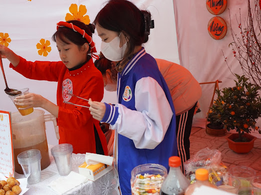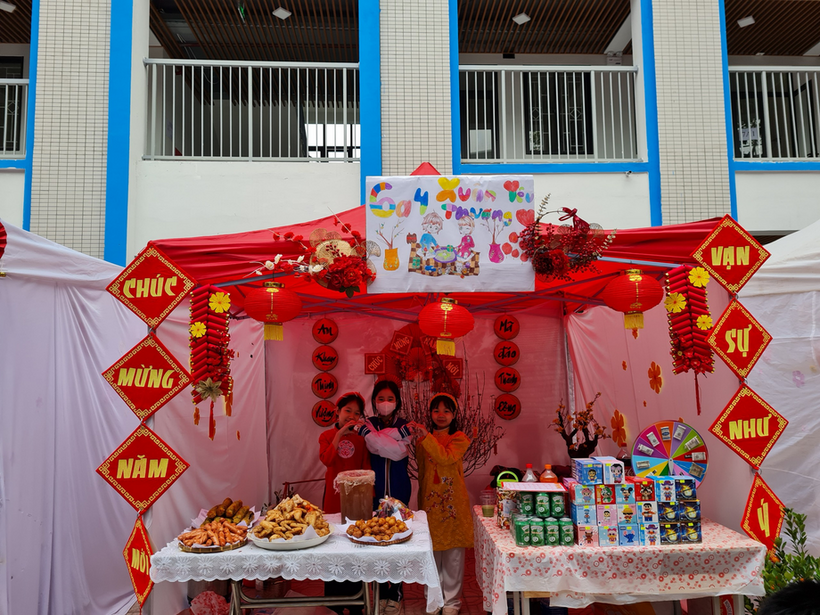 Ngay khi có thông báo về ngày hội, chúng tôi bắt đầu lên kế hoạch dựng trại, trang trí trại và bán các loại hàng mà các bạn yêu thích. Các “họa sĩ” lớp tôi đã được phân công trang trí lên hai bảng phụ những cành hoa mai, những câu đối đỏ và rồi là cả những chú mèo đang mặc những chiếc áo dài ngồi làm những chiếc bánh chưng và thế là một chiếc biển “Xuân yêu thương” đáng yêu được ra đời. Tiếp đến, chúng tôi bắt đầu trang trí gian hàng. Có lẽ đây là bước khó khăn nhất vì lúc đầu chúng tôi thiếu nguyên liệu khá nhiều. Lũ học trò chúng tôi đã phải chạy ngược, chạy xuôi để tìm cho đủ. May sao các bác phụ huynh cũng đã đến hỗ trợ. Và thế là chúng tôi đã tạo ra một gian hàng nhỏ nhỏ, xinh xinh rực rỡ với cành đào, cây quất, với bánh chưng xanh và câu đối đỏ. Mỗi một góc trại đều được bọn trẻ chúng tôi trang trí đẹp mắt. Ngắm nhìn thành quả sau cả một ngày trang trí chúng tôi ai cũng náo nức vui mừng.