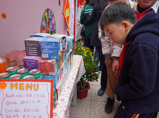 Tầm chín giờ hai mươi phút, các học sinh được tham quan, mua sắm, tham gia các trò chơi dân gian từ các gian hàng của khối 6. Trong trường các gian hàng bày bán của các lớp được trang trí rất bắt mắt. Các món đồ ăn, đồ chơi được trưng bày ngay ngắn, đẹp đẽ. Các bạn học sinh tham gia mua bán vô cùng náo nhiệt. Và tôi sau một hồi loanh quanh tham khảo giá đã chốt cho mình một bộ lego và hai chiếc xúc xích thơm lừng.