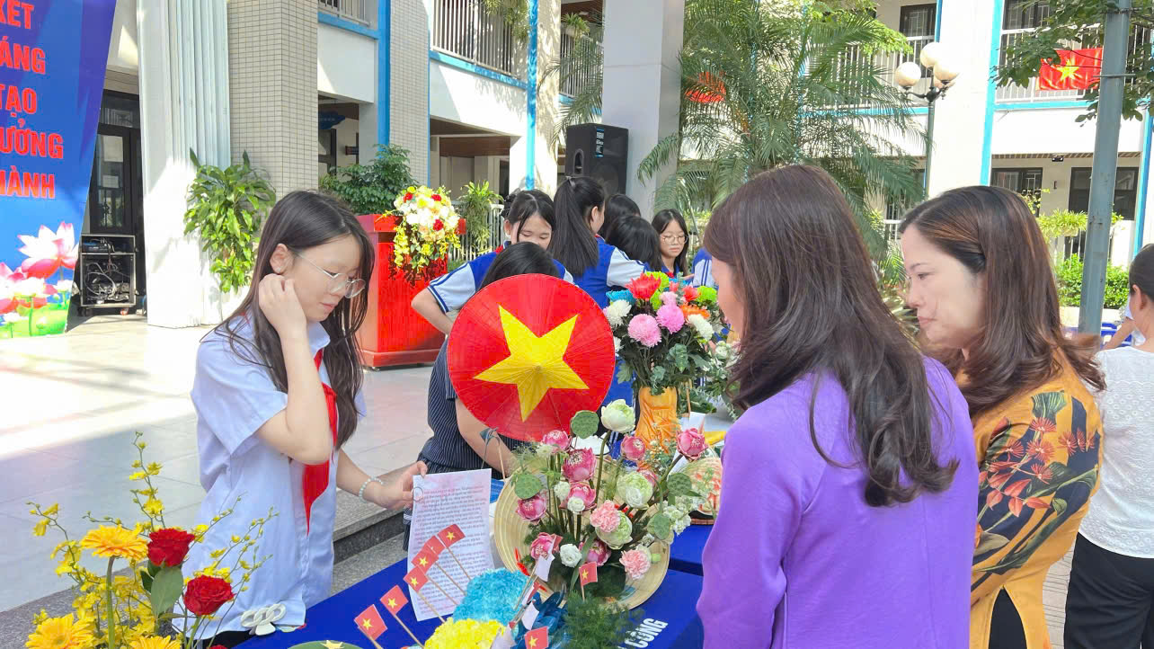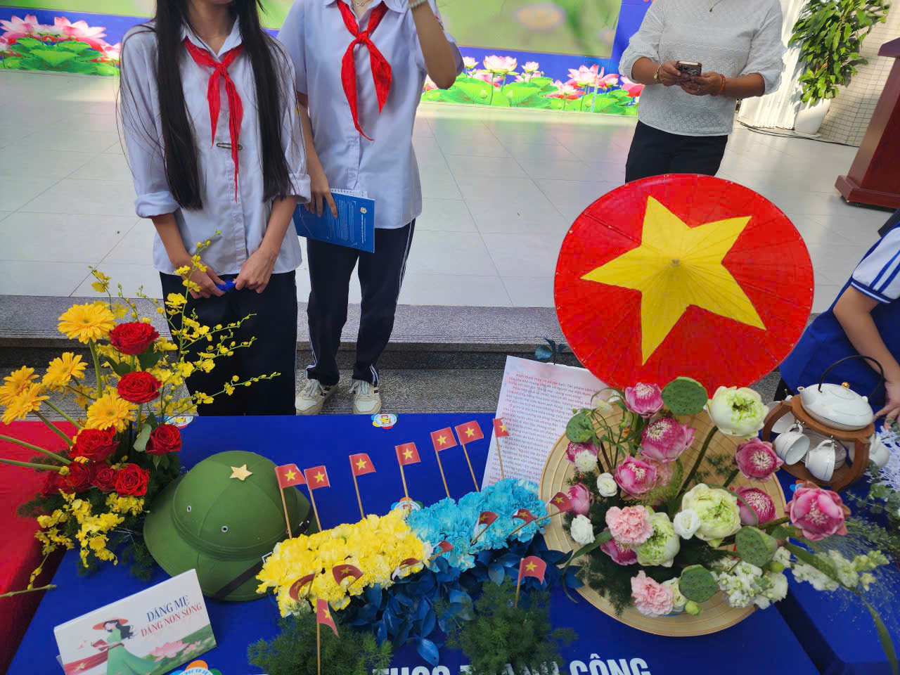 Phần thuyết trình là điểm nhấn quan trọng, giúp truyền tải đầy đủ thông điệp của tác phẩm đến Ban giám khảo và người xem. Người đại diện lớp 8A6 đã tự tin, xúc động chia sẻ ý nghĩa từng chi tiết cắm hoa, làm nổi bật tinh thần tri ân và niềm t ự hào dân tộc