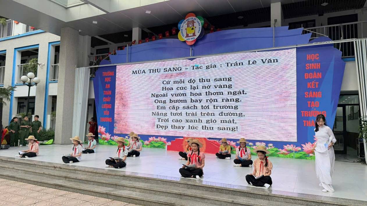 Tiết mục mở đầu bằng giai điệu dịu dàng của “Em yêu trường em”. Sân khấu trở thành một lớp học mùa thu thật yên bình, nơi tiếng lá khẽ rơi hòa với tiếng cười nói trong trẻo. Những bước chân nhẹ nhàng, mềm mại của chúng em như đưa khán giả trở về với mái trường thân quen, nơi mỗi ngày đều đầy ắp yêu thương.