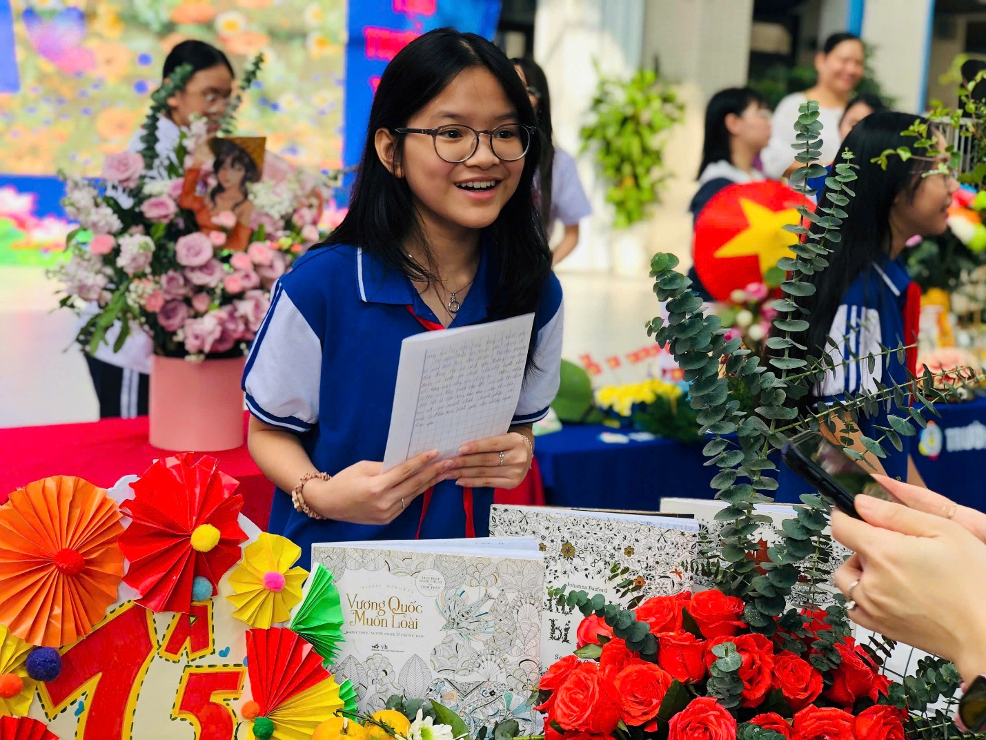 Trong phần thuyết trình, đại diện lớp 7A5 đã tự tin chia sẻ ý tưởng và cảm xúc của tập thể, thể hiện tình yêu chân thành và thông điệp nhân văn sâu sắc qua từng chi tiết của giỏ hoa.