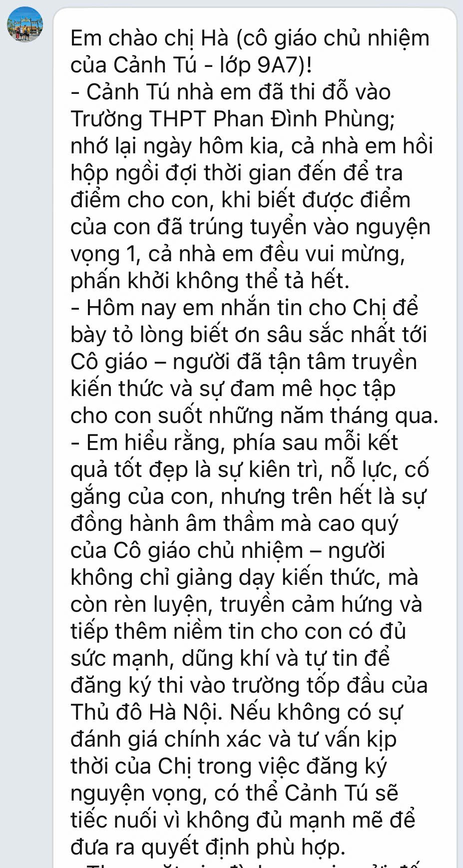 Lời tri ân của Phụ huynh học sinh Nguyễn Cảnh Tú - một học sinh thông minh, luôn cố gắng vươn lên.