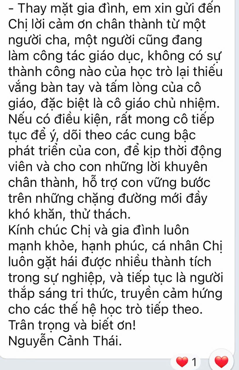 Trong các món quà ấy, cô chủ nhiệm thực sự thấy ấm áp trước những lời tâm sự, chia sẻ của các phụ huynh học sinh sau khi các con đã vượt qua một kì thi nhiều khó khăn, thử thách. Đó là nguồn động viên vô giá đối những người làm nghề giáo khi được phụ huynh đồng cảm, thấu hiểu và trân trọng.