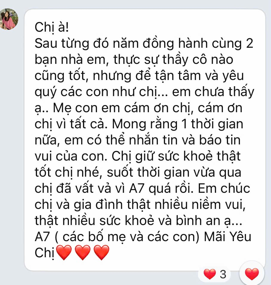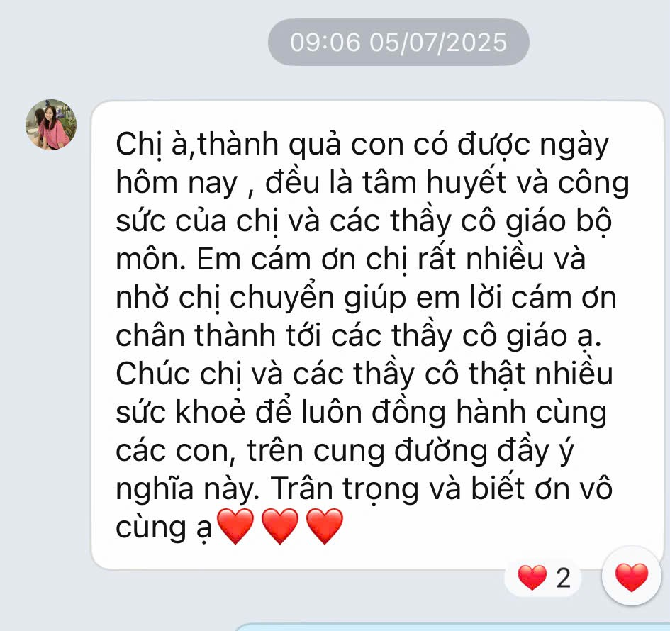 Kể từ khi mang sứ mệnh người thầy tôi luôn ý thức được trọng trách của mình là hết lòng vì học sinh thân yêu, tận tâm với nghề để luôn mong muốn ươm trồng nên những công dân sau này có tri thức, có đạo đức và biết sống tử tế. Thật vui, trên hành trình của mình tôi luôn có sự đồng hành tuyệt vời của Ban giám hiệu nhà trường, của các đồng nghiệp tận tâm và đặc biệt là sự đồng cảm của các bậc phụ huynh và các con học sinh lớp 9A7. Với một lớp có sự phân hóa cao về nhận thức, nhiều học sinh gia đình có hoàn cảnh khó khăn nên ngoài việc giảng dạy sao cho phù hợp với các đối tượng học sinh thì việc tư vấn chọn trường, hỗ trợ các bậc phụ huynh và các con học sinh là vấn đề mang nhiều trăn trở. Có trồng cây ắt có ngày hái quả, 9A7 đã mang đến cho cô những trái ngọt.