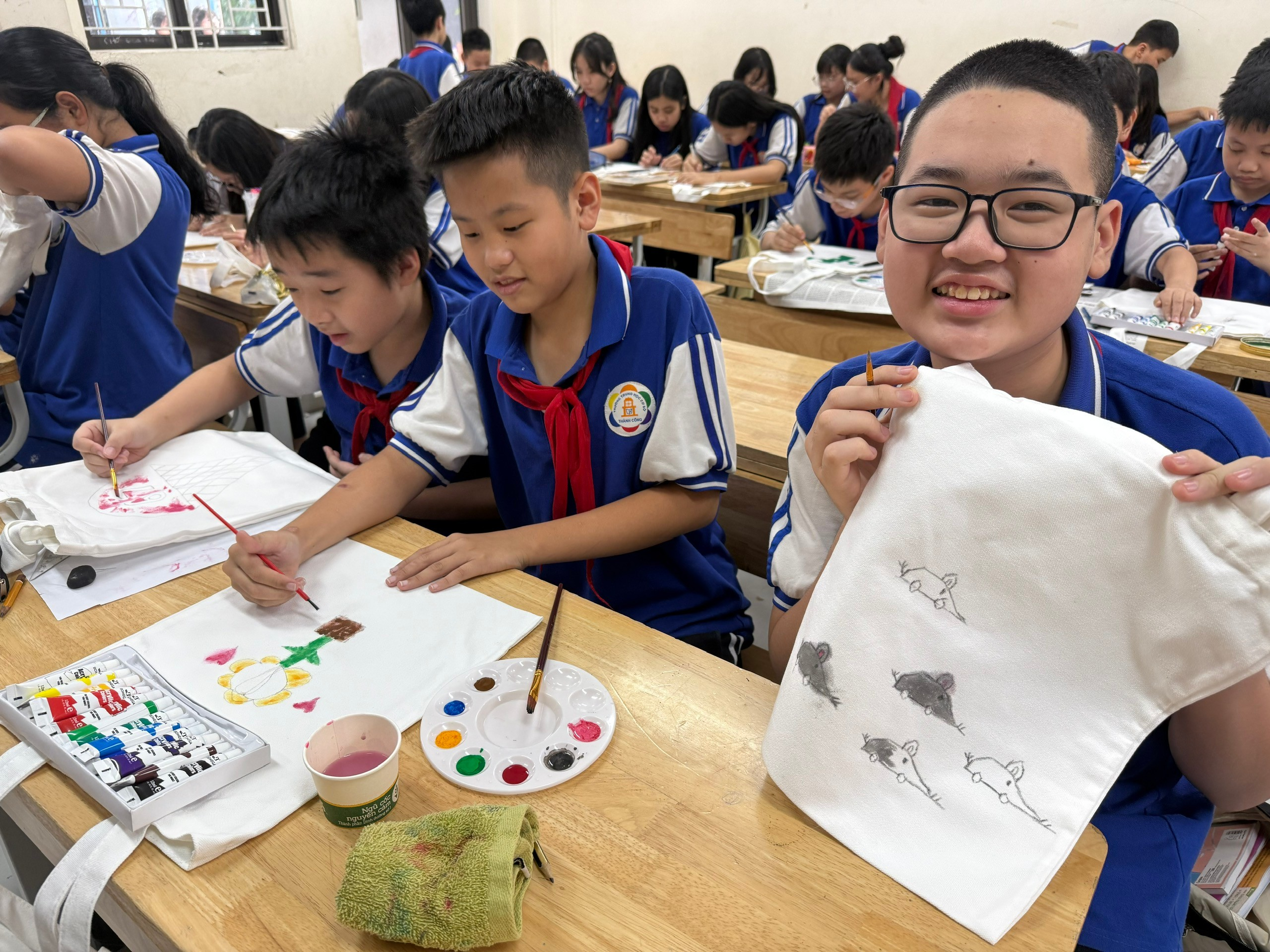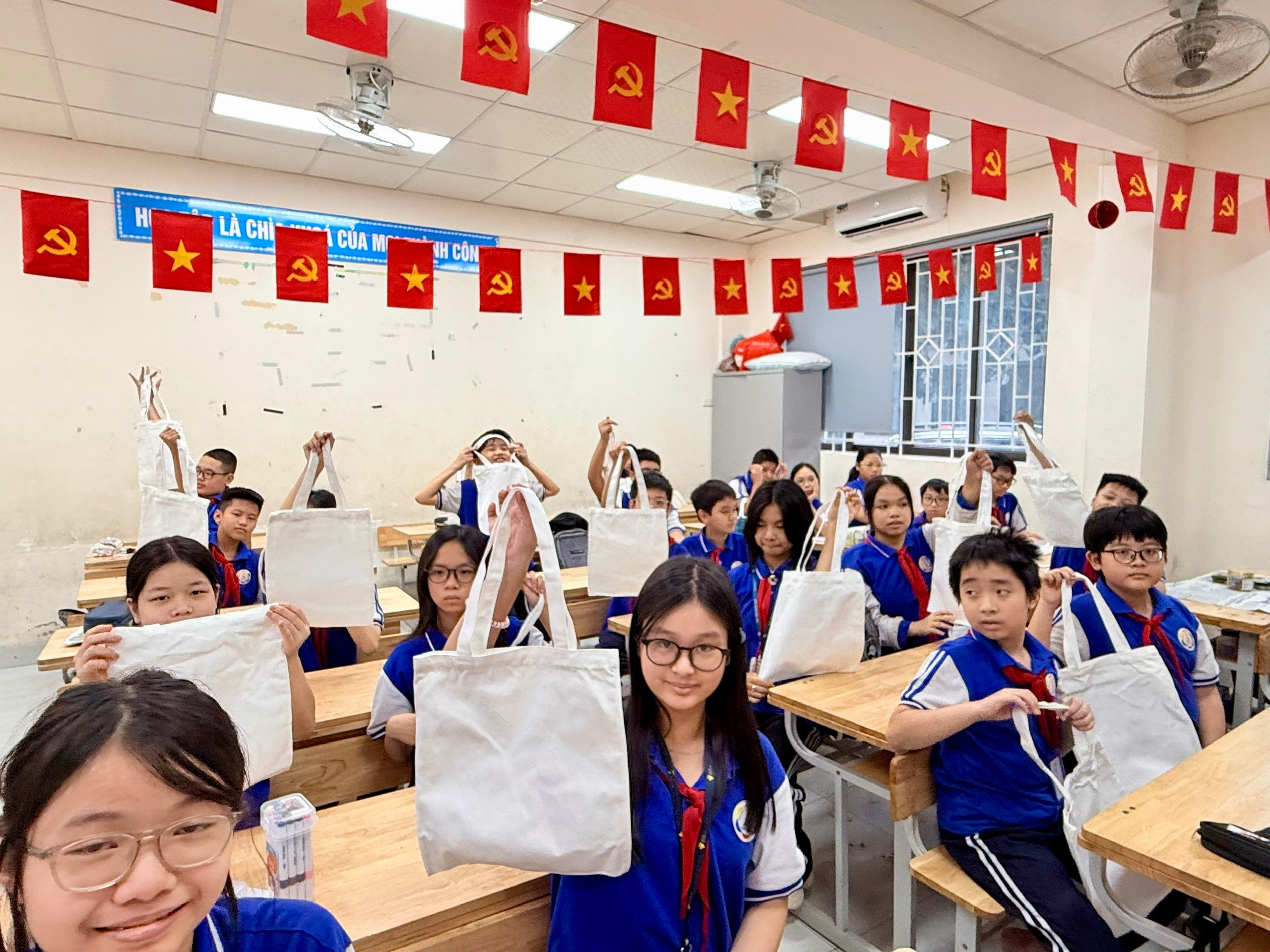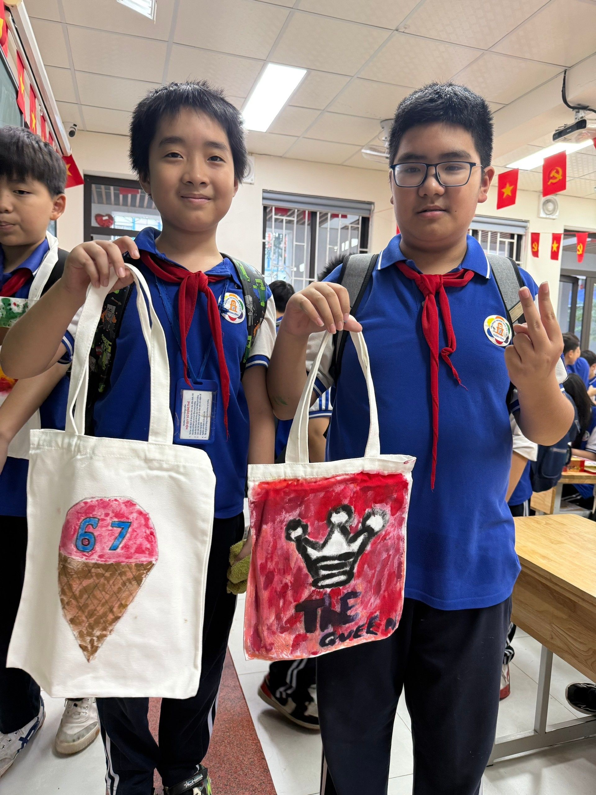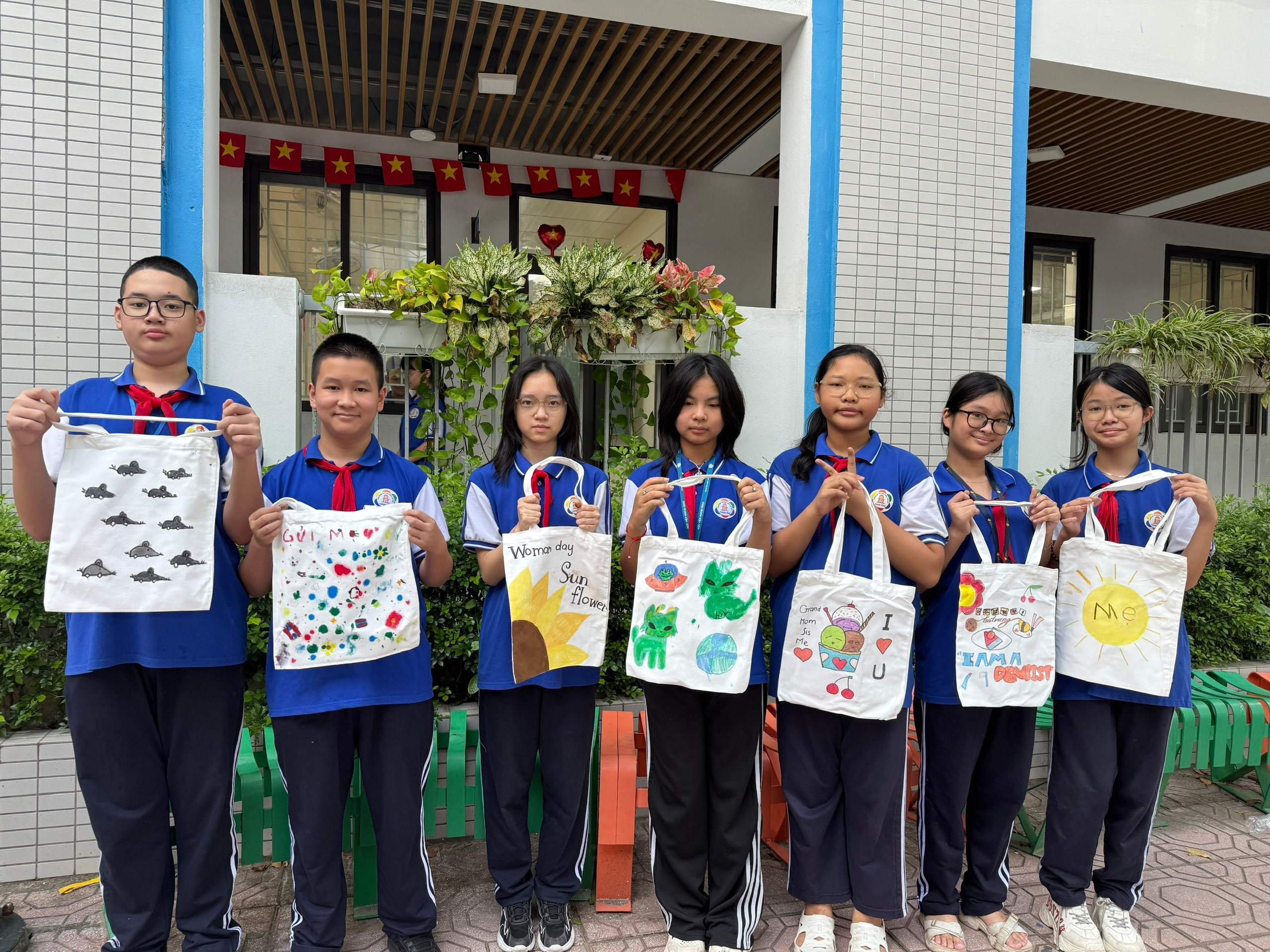 Chiếc túi vải ban đầu chỉ là màu trắng đơn giản. Nhưng qua bàn tay khéo léo và khối óc sáng tạo của các bạn lớp 7A6, chúng đã biến thành những tác phẩm nghệ thuật độc đáo, mang đậm dấu ấn cá nhân và tình cảm con cái.