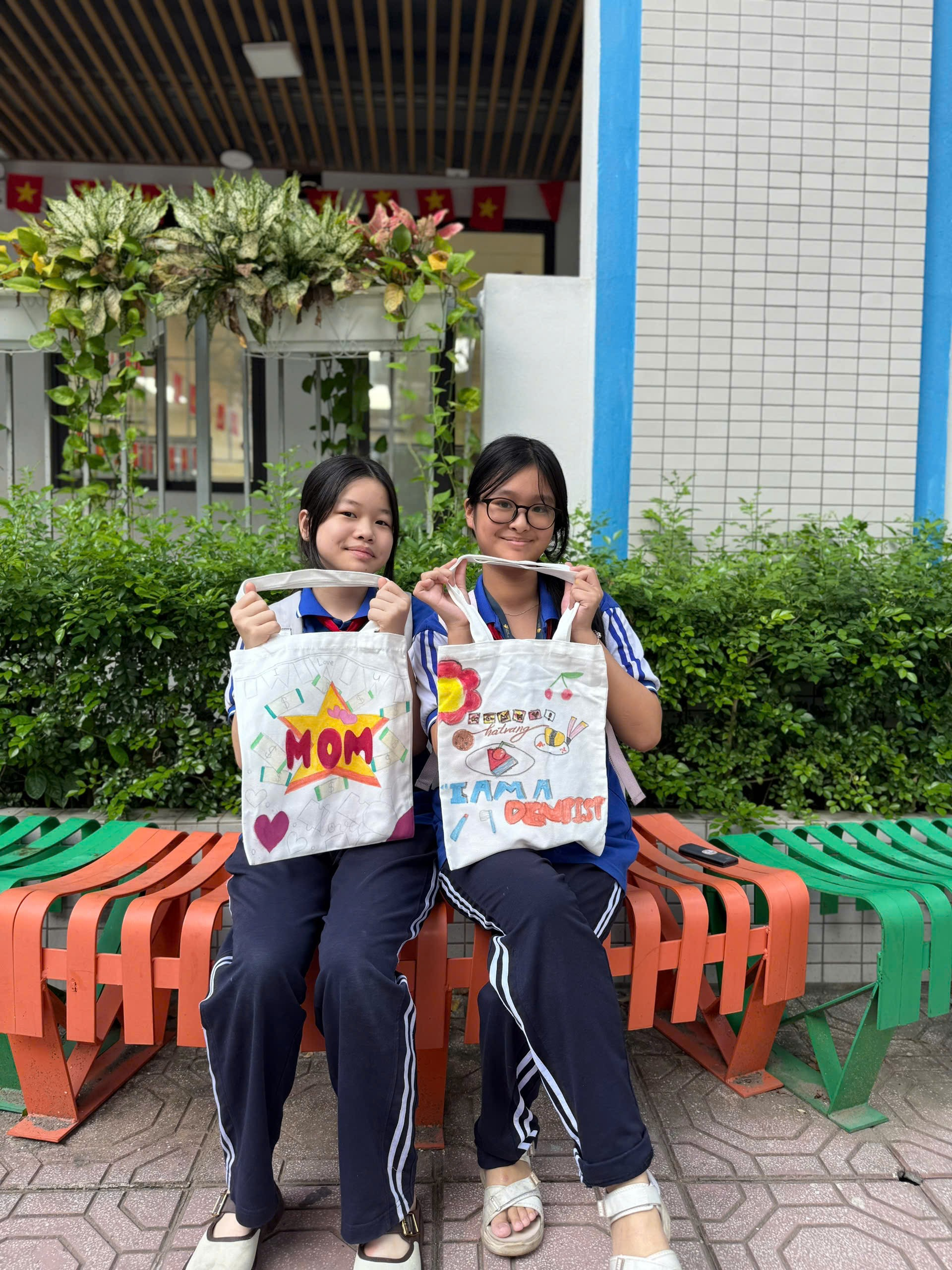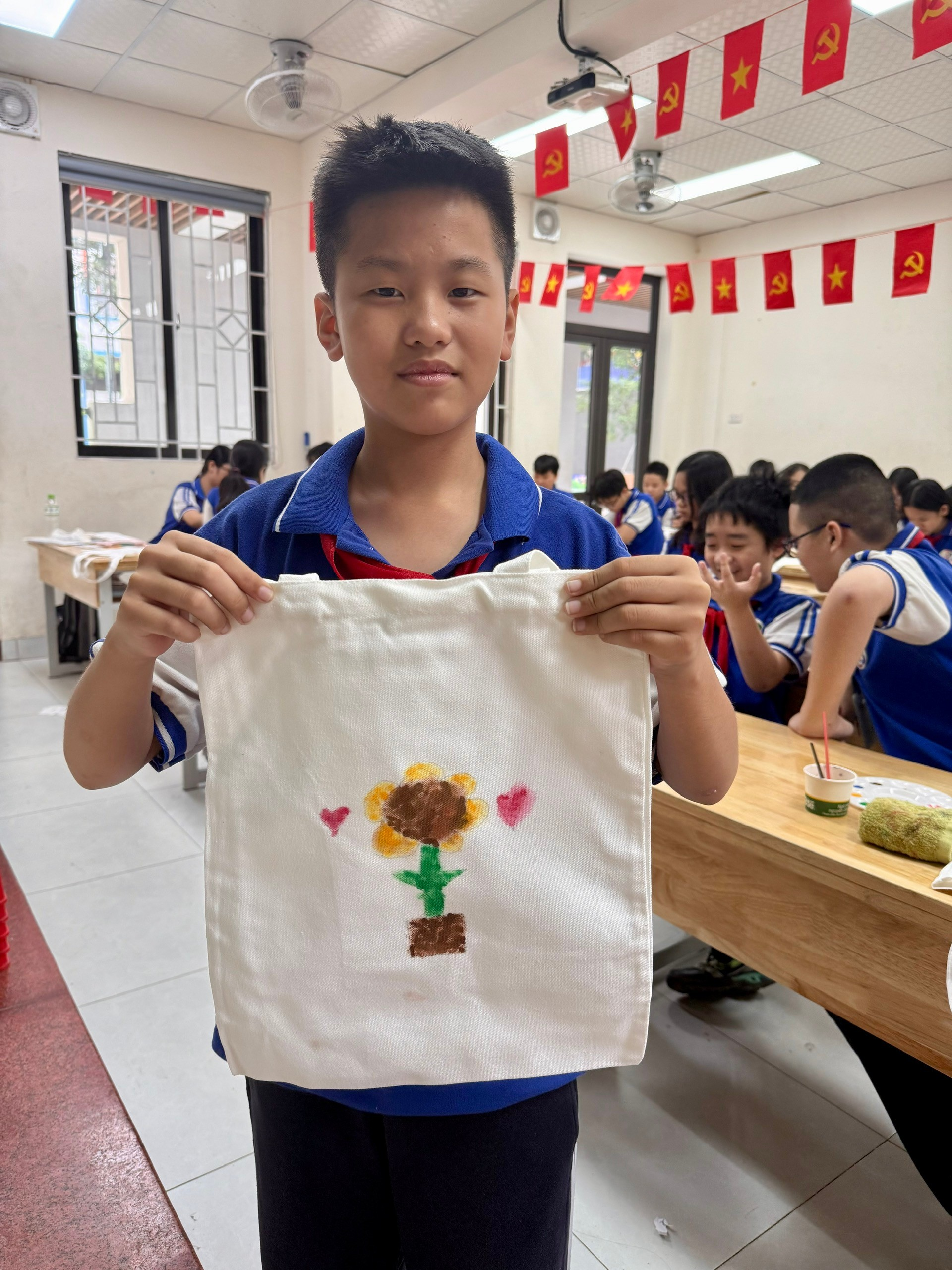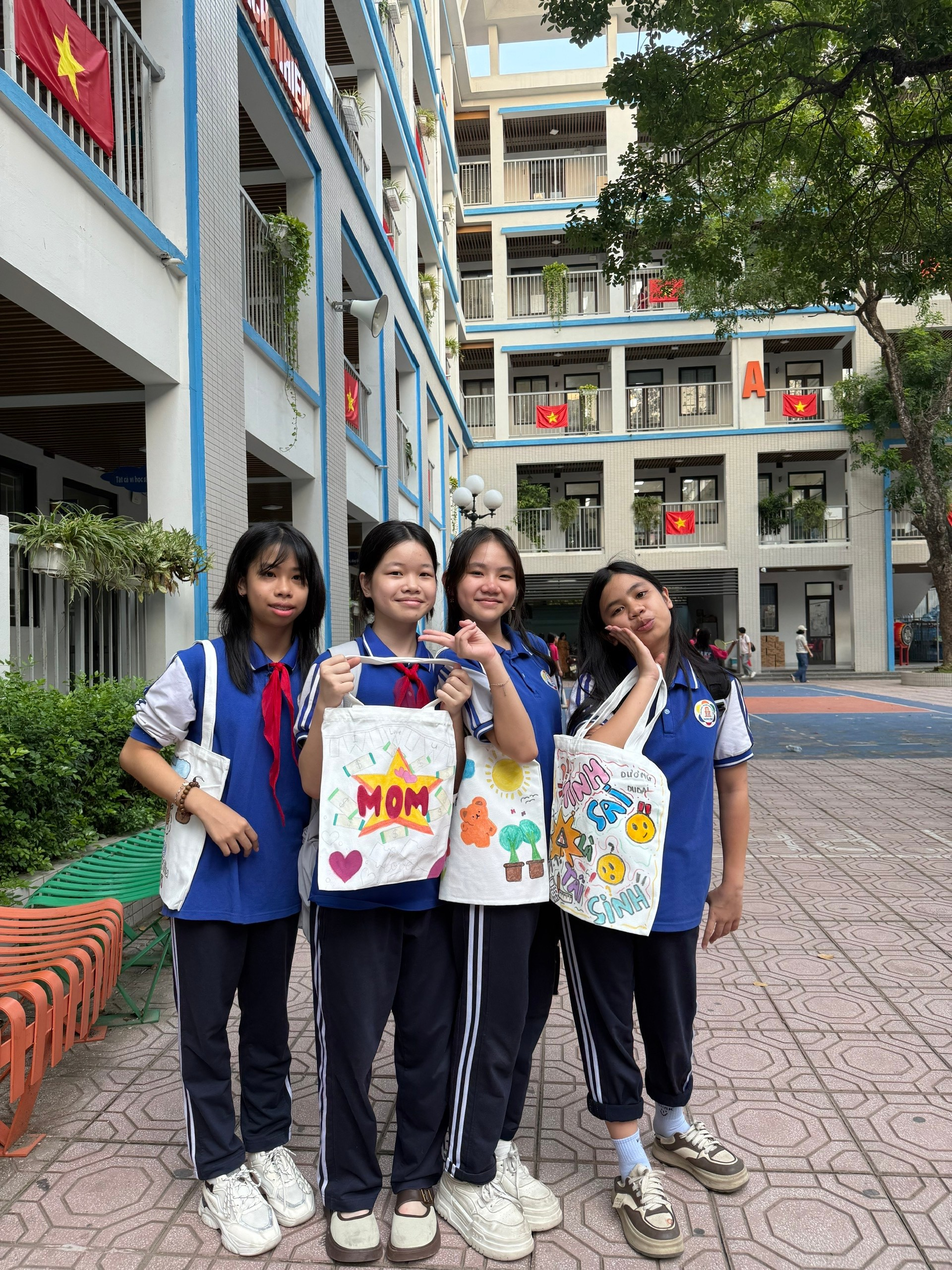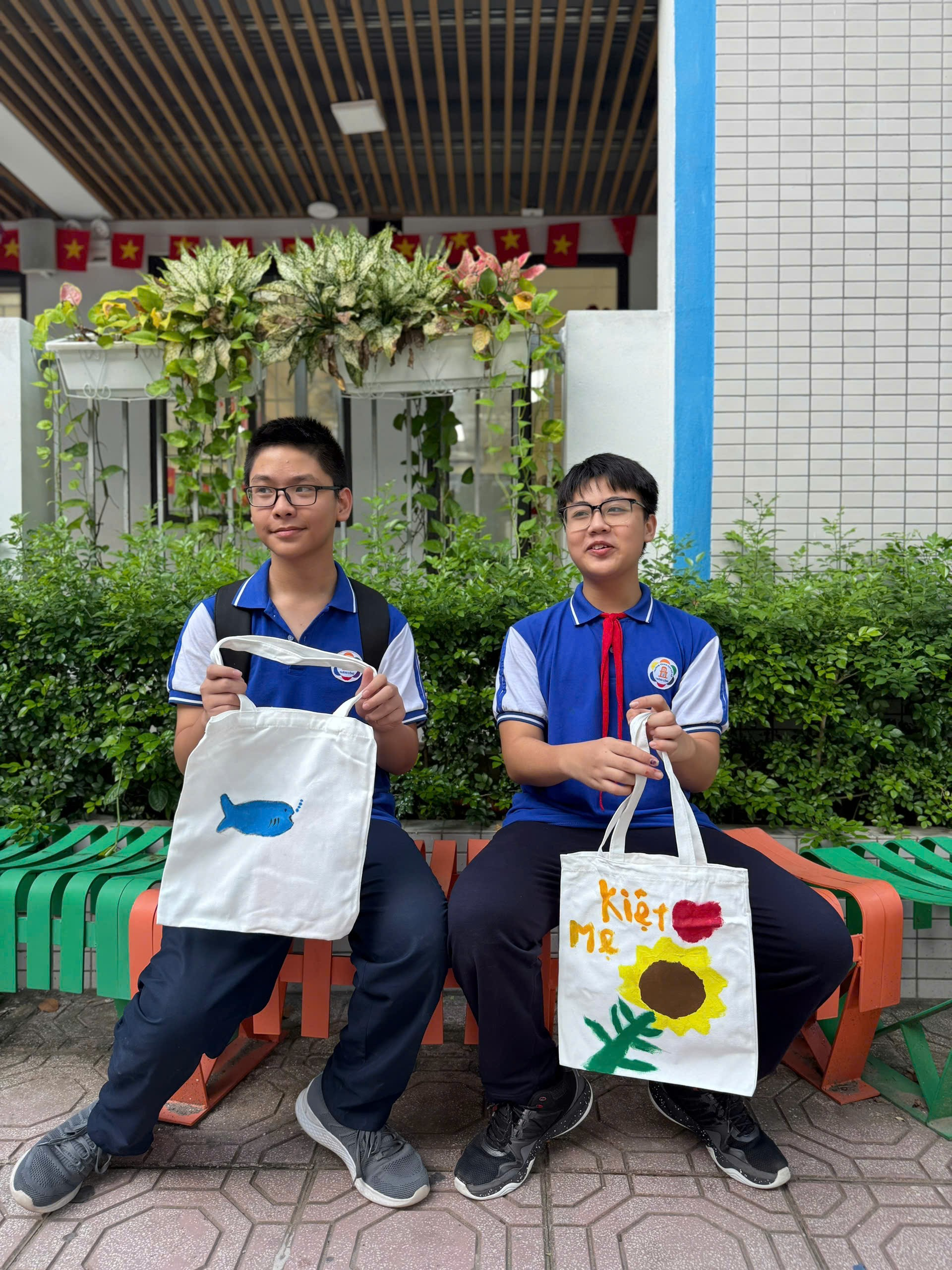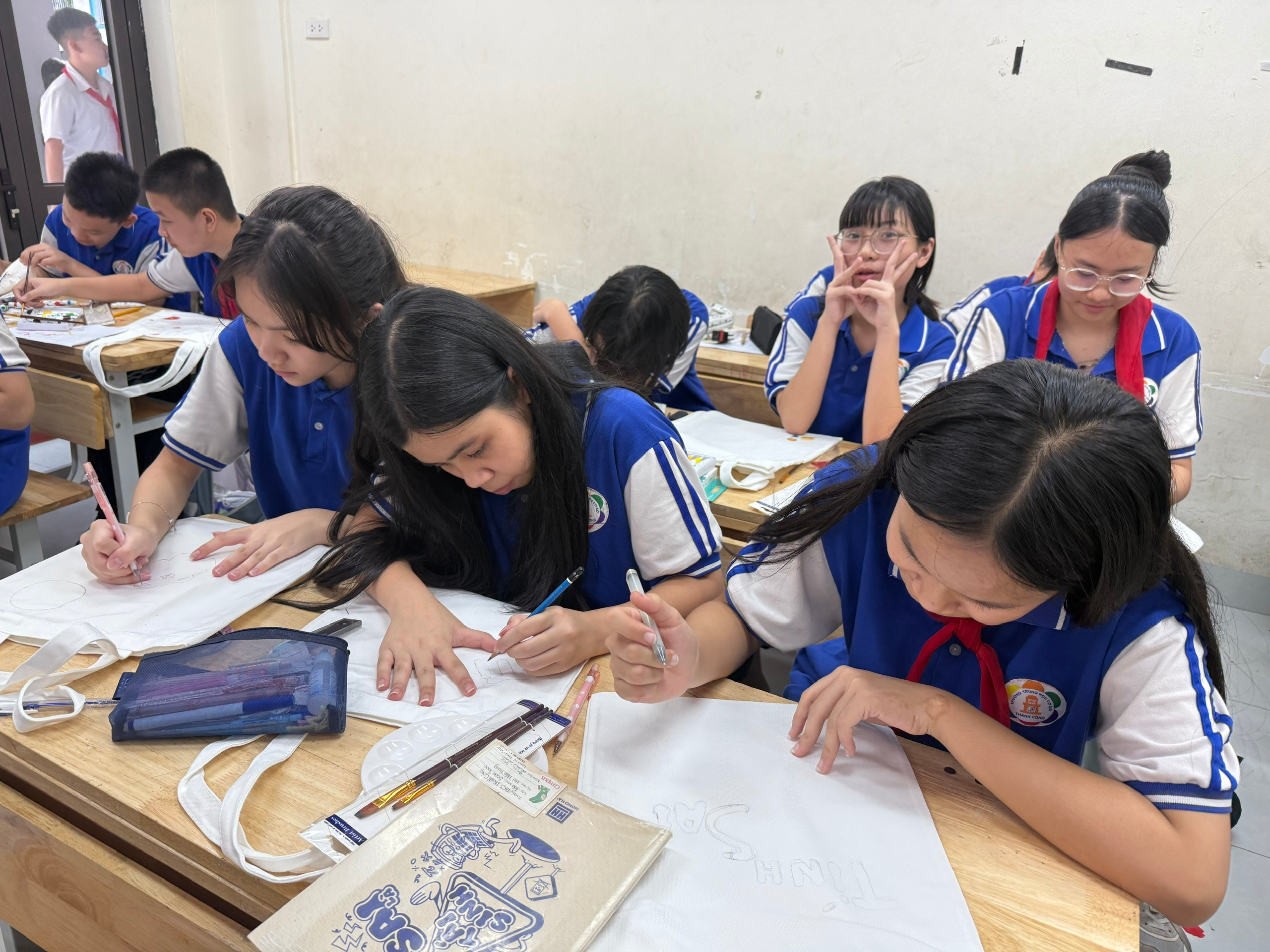 Chiếc túi vải ban đầu chỉ là màu trắng đơn giản. Nhưng qua bàn tay khéo léo và khối óc sáng tạo của các bạn lớp 7A6, chúng đã biến thành những tác phẩm nghệ thuật độc đáo, mang đậm dấu ấn cá nhân và tình cảm con cái.