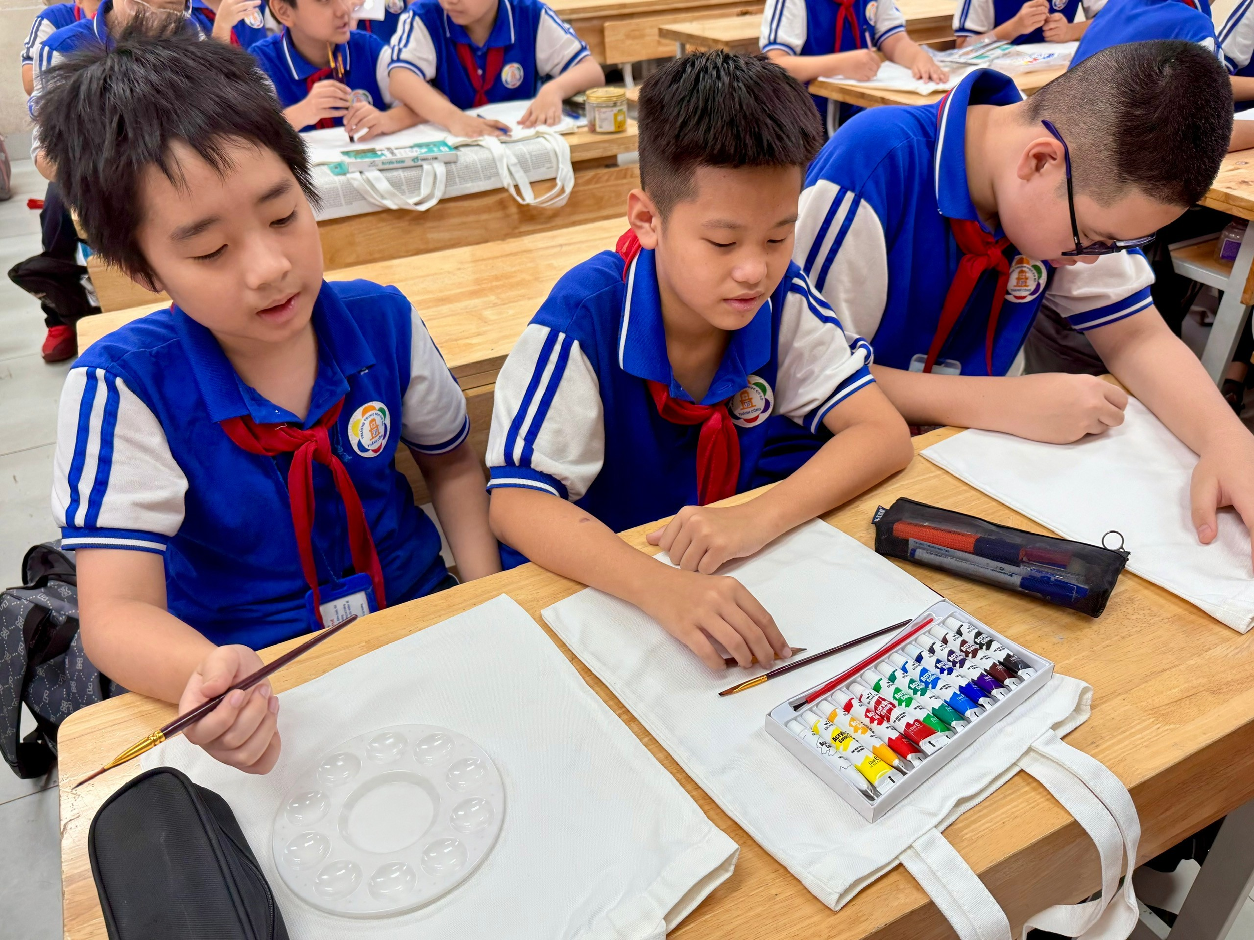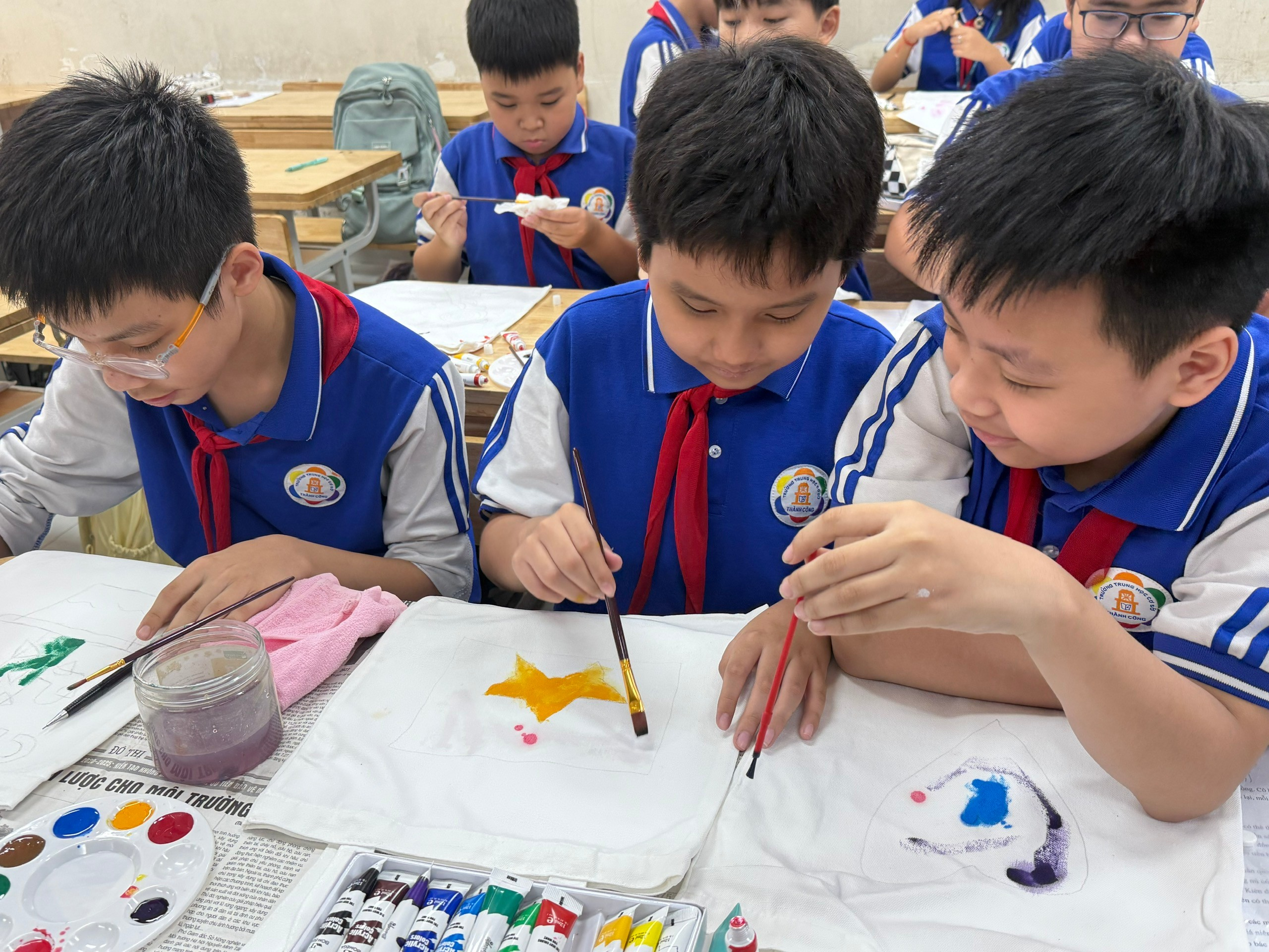 * Say mê tô vẽ: Chúng mình sử dụng màu vẽ chuyên dụng cho vải, cẩn thận từng nét cọ, phối màu sao cho thật hài hòa và nổi bật. Hoạt động này không chỉ rèn luyện sự tỉ mỉ mà còn là lúc các bạn thể hiện sự kiên nhẫn và tập trung cao độ.