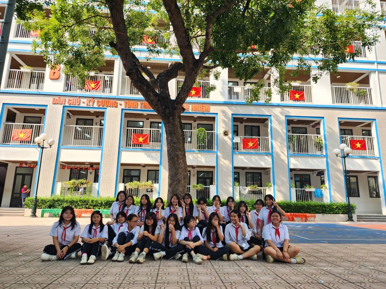 Những cô gái xinh đẹp lớp 8A6 tận hưởng vẻ đẹp của mùa thu trên sân trường