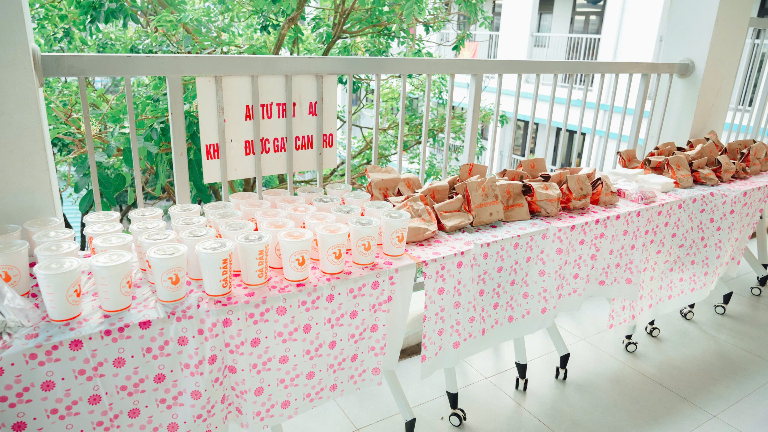 Sau những tràng cười, cả lớp bước vào phần được mong chờ nhất: gà rán, khoai tây chiên và coca. Mỗi bạn đều có một suất riêng, không khí “dzô dzô” vang vọng cả lớp. Có bạn vừa cắn miếng gà rán vừa ví von: “Cánh gà giòn như nhạc EDM!”, bạn khác nâng cốc coca reo lên: “6A vô đối!”. Những ly coca sủi bọt, những nụ cười rạng rỡ khiến buổi chiều Trung Thu thêm sảng khoái và náo nhiệt.