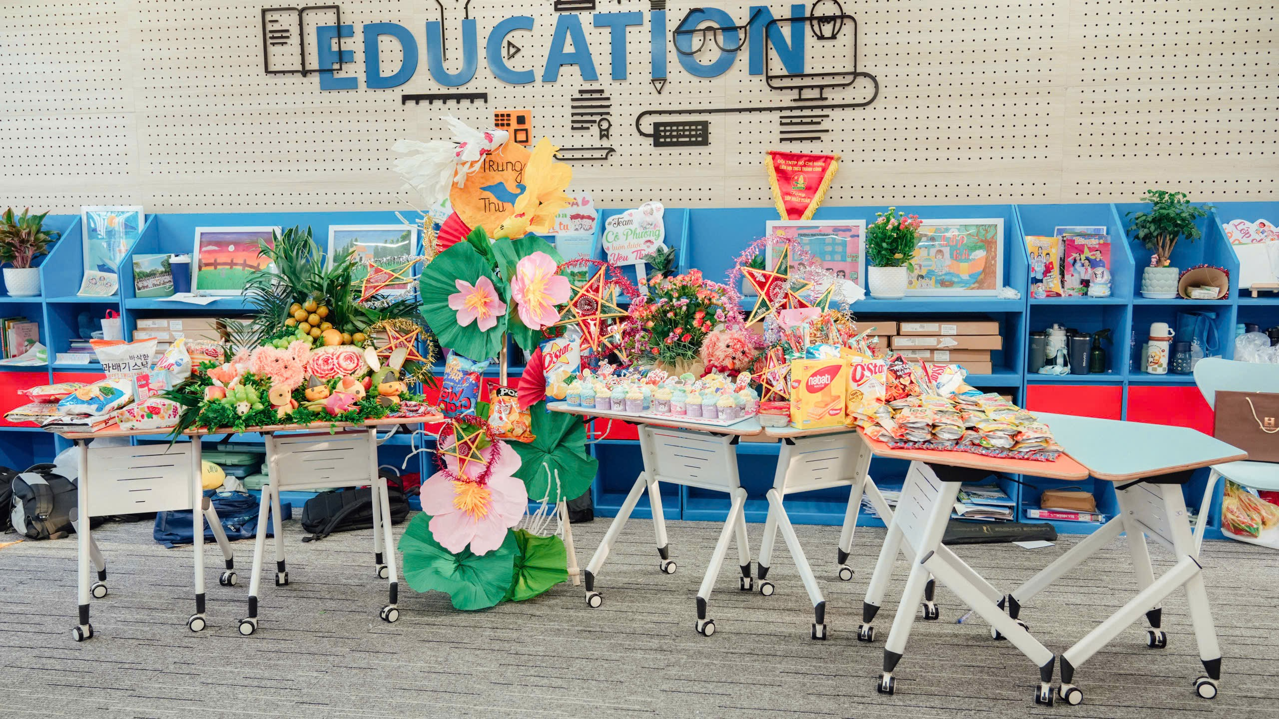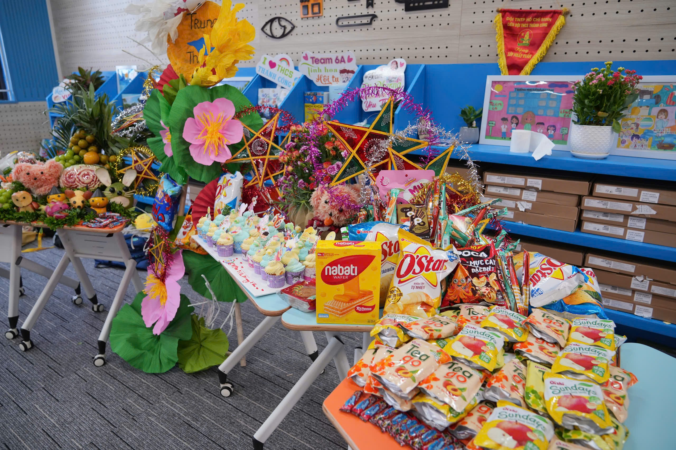 Khi bụng đã no, cả lớp quây quần bên mâm cỗ Trung Thu truyền thống với bánh nướng, bánh dẻo, bưởi, hồng, kẹo, thạch… Một bạn nhanh trí nhận vai MC bình luận: “Bưởi mát lành 9,5 điểm. Bánh trung thu nhân trứng muối 10/10 nhưng không khuyến khích cho bạn đang niềng răng. Kẹo thì ngọt hơn nụ cười crush, còn thạch lung linh như ánh đèn hội rằm.” Những lời bình dí dỏm xen tiếng cười đã làm mâm cỗ trở thành nơi gắn kết tuyệt vời! Và phía sau đó là sự chuẩn bị chu đáo từ cô Phương, cô giáo chủ nhiệm của chúng mình và các bố mẹ các bạn – những người lặng lẽ góp phần để “bữa tiệc có một không hai” này thêm đủ đầy.