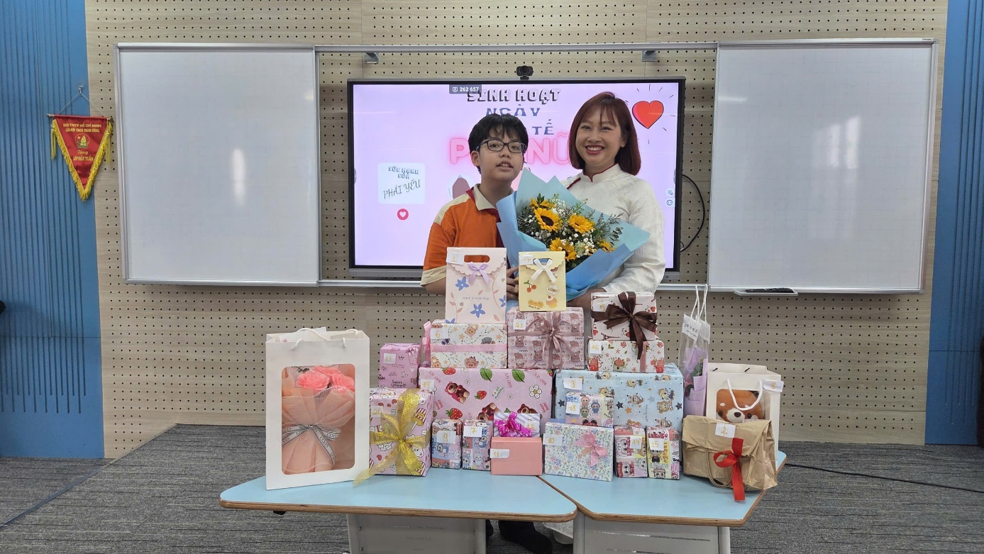 Tiếp đó, các bạn nam đã lần lượt gửi những lời chúc tốt đẹp tới cô giáo và các bạn nữ trong lớp. Những lời chúc giản dị và chân thành khiến không khí lớp học trở nên thật ấm áp. Nhiều bạn nữ đã rất bất ngờ và vui thích khi nhận được những món quà nhỏ xinh được chuẩn bị từ trước.
