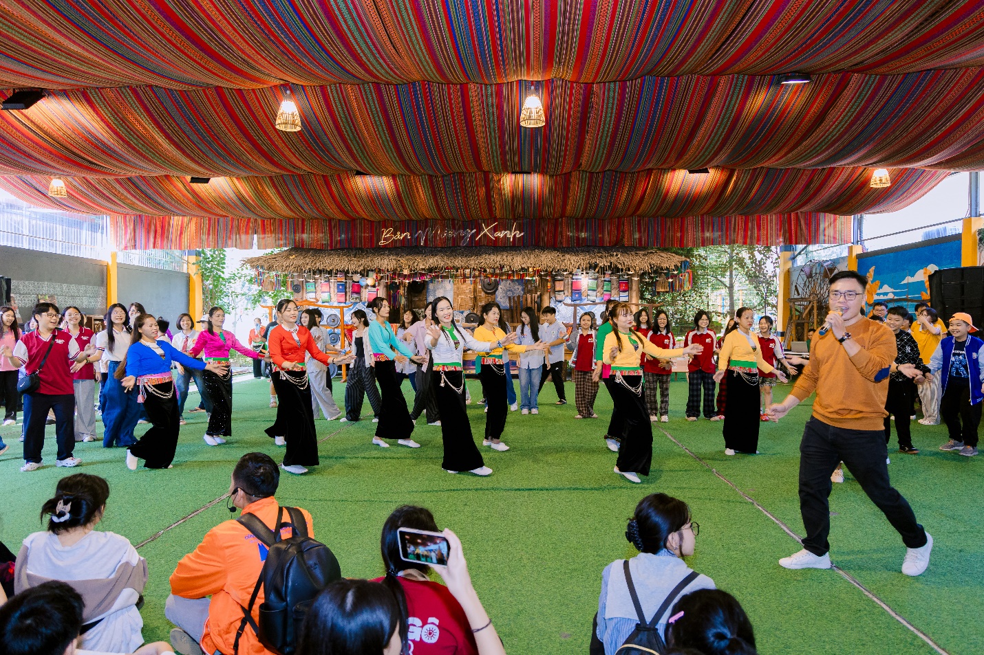 Khoảng 8h30, đoàn có mặt tại Bản Mường Xanh. Các bạn học sinh được chào đón bằng tiếng cồng chiêng và điệu múa truyền thống – âm thanh vang vọng giữa núi rừng tạo nên cảm giác thiêng liêng và đầy tự hào về văn hóa dân tộc. Sau đó, học sinh gửi đồ tại khu nhà sàn và bắt đầu hành trình khám phá.